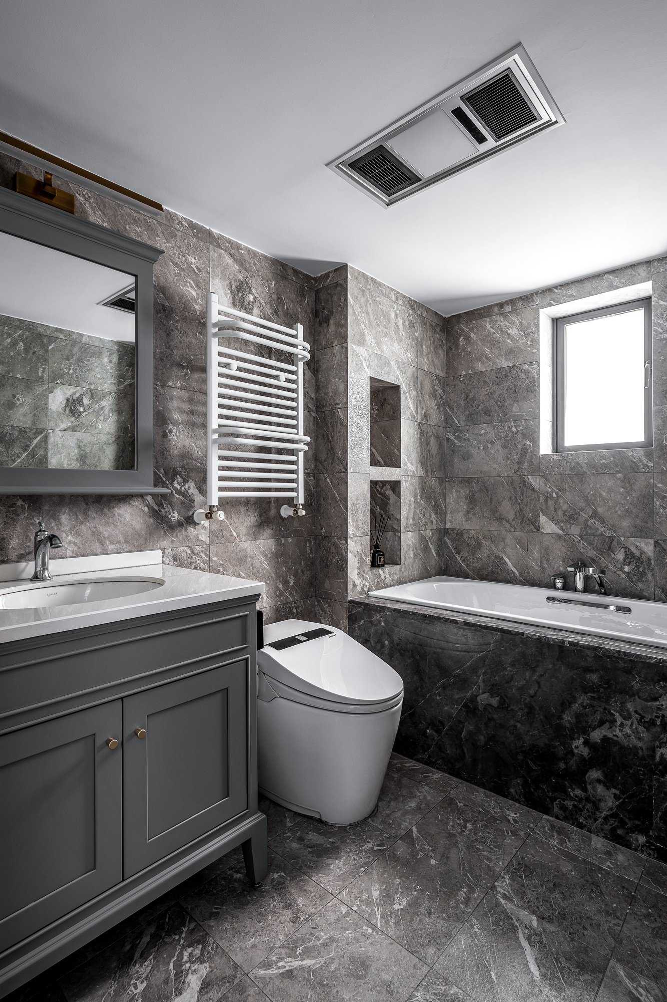 深灰與意大利淺灰大理石瓷磚的鋪貼締造了家里最后一個(gè)私人空間的完美性。幸福是早晨被陽光喚醒起床刷牙的時(shí)候,也是當(dāng)身體沉入溫暖的水浴中被帶走一身疲憊的時(shí)候。