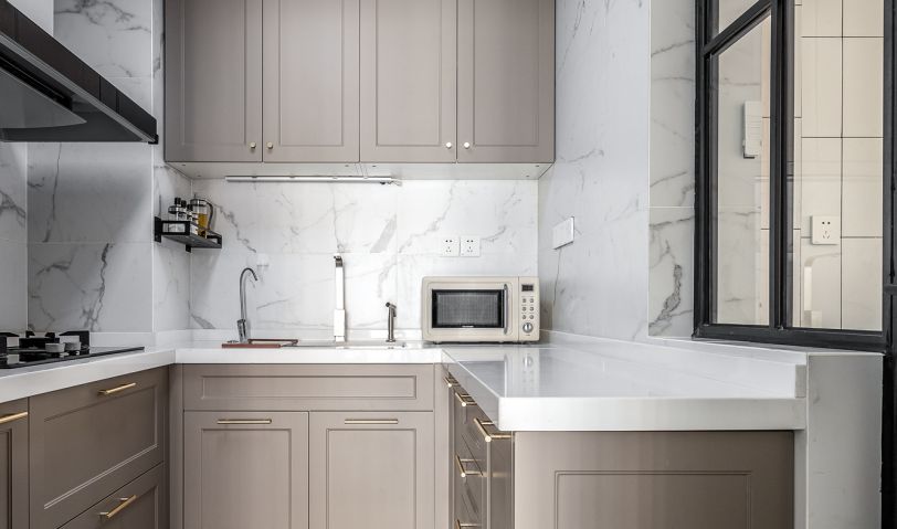 中廚與開放式西廚風(fēng)格相互融合呼應(yīng),灰咖色搭配大理石貼磚,低保和色彩感讓人舒適與放松。