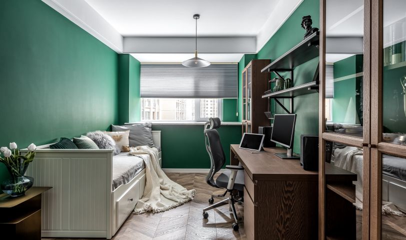 書房使用屋主喜愛的墨綠色,去掉金屬元素改用原木色書柜搭配也讓整個(gè)環(huán)境仿佛置身于清新的大自然中。大人的良好學(xué)習(xí)習(xí)慣往往也是影響孩子未來生活的重要途徑,在這個(gè)充滿氧氣的森林里互相陪伴,共同成長。