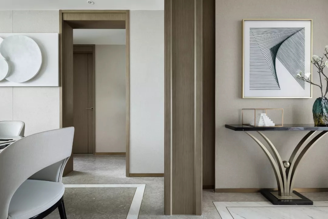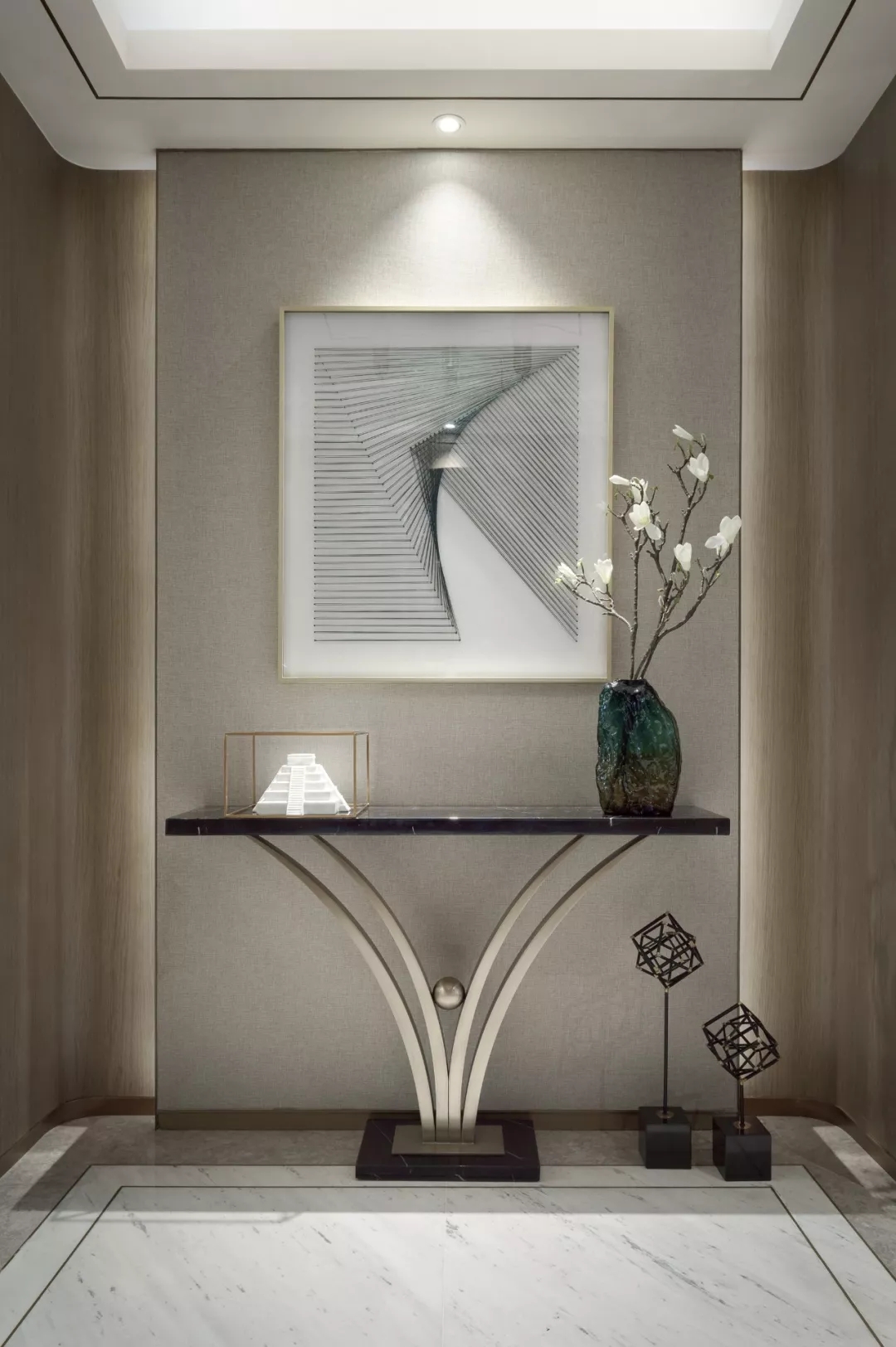 由幾何線條勾勒出的簡凈優雅的墻面掛畫,與瑩白似玉的藝術擺件、節短枝密的清雋玉蘭花藝,氣質相映而美感互融,點點滴滴凝聚成入戶玄關的美學曲調。