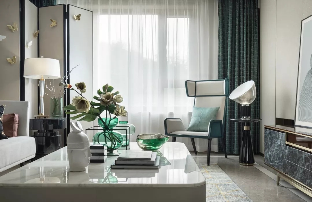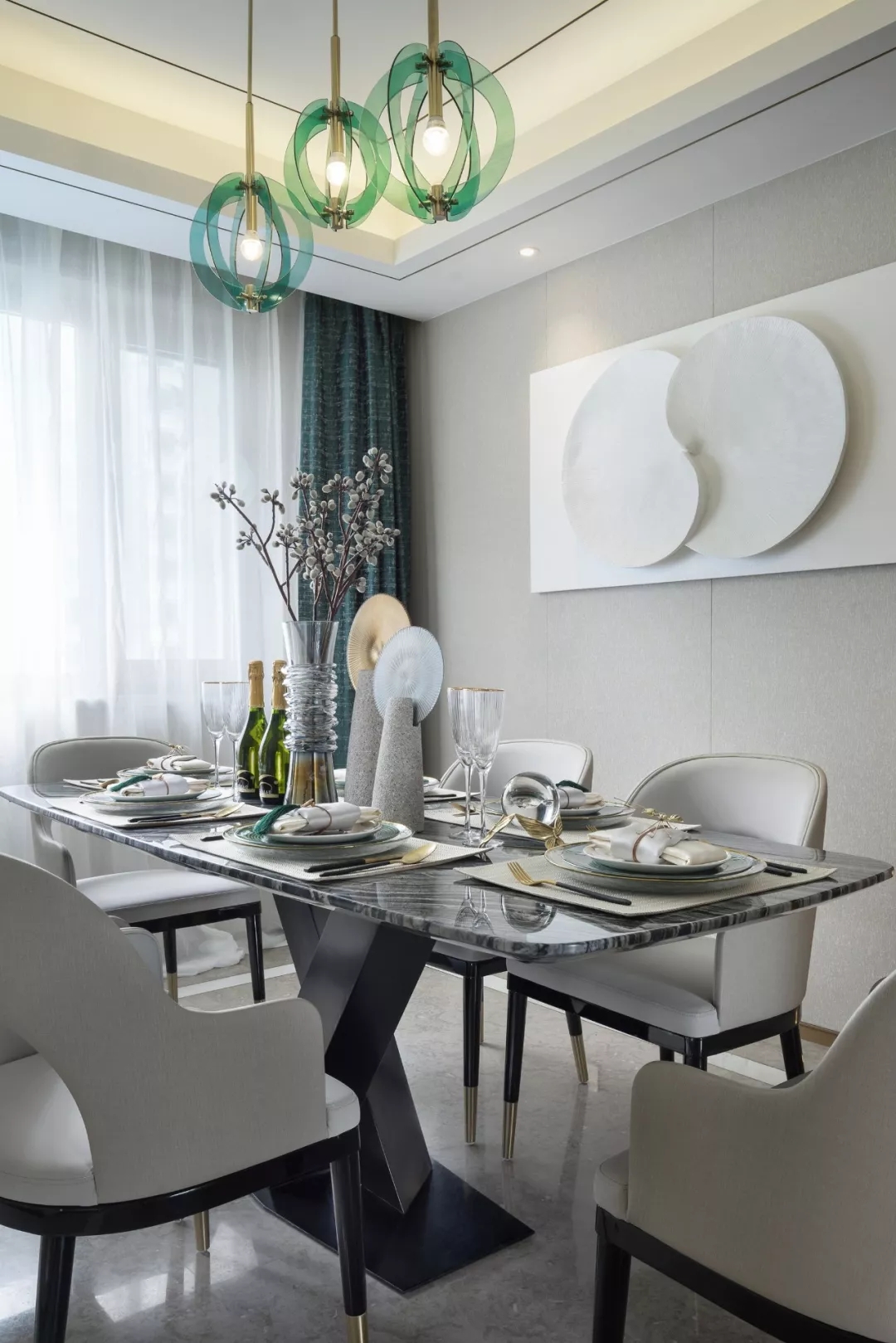 客廳的設計語言,浸潤在極致清透的空間意境里,設色上依循祖母綠調與溫柔杏色的主次比例,同時搭配精致而巧妙的細節,清新花藝點綴生氣,金色蝴蝶停駐于藝術屏風上,祖母綠單椅意蘊濃厚......空間于當代意境中透露著雋雅的氣質。