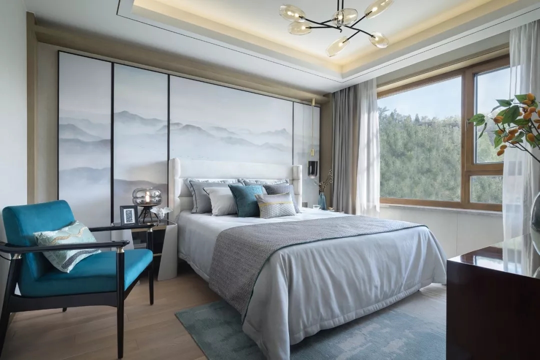清雅的樂律隨著設計的筆法,流轉至主臥的氣質之中。空濛山水畫幅點綴著背景墻,與潑墨落筆的書法掛畫相映成趣,淺藍釉花瓶中的干枝花藝樸拙而自然,皆寫意著清秀與靜雅的藝術之境,這個舒緩身心的休憩空間便沉浸在溫柔的氣息里。