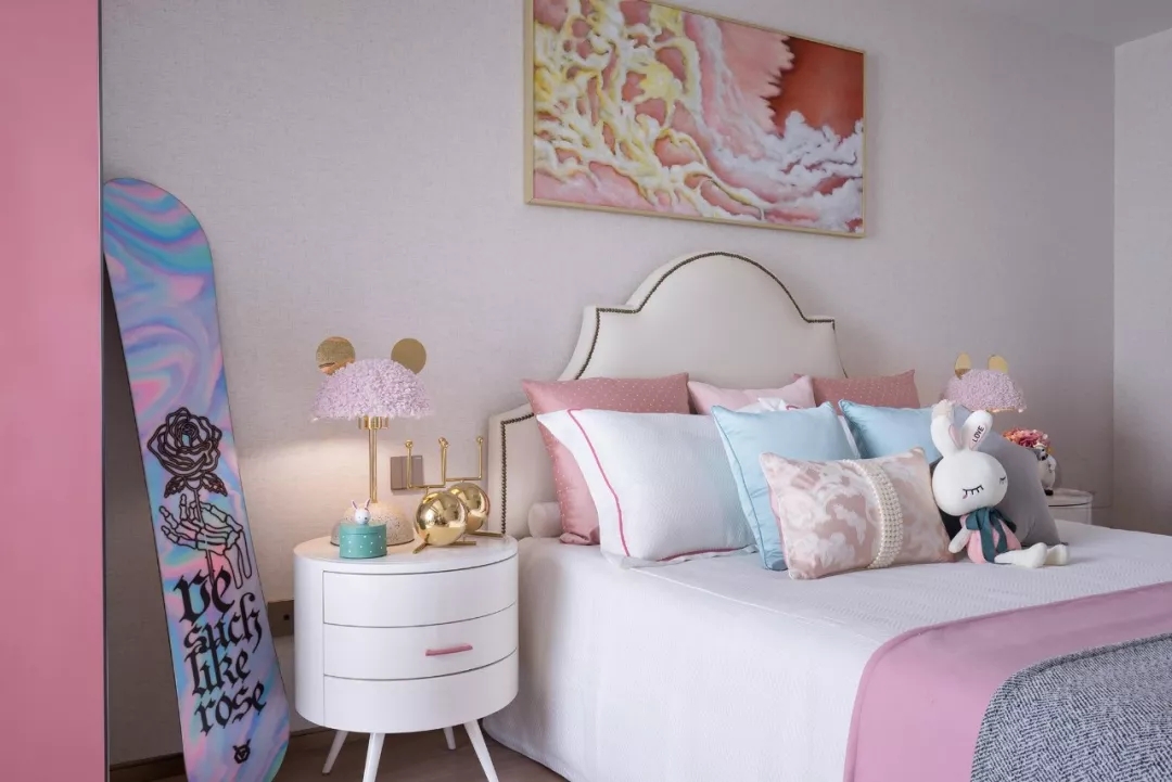 女孩房以粉白的淺色調著筆,細致地摹畫出一個小女孩內心深處的世界,夢幻而童真。芭比娃娃、個性沖浪板、布藝玩偶、潔白窗紗......這些小女孩在童話書中憧憬的美好元素,醞釀出活潑可愛的空間氣韻。