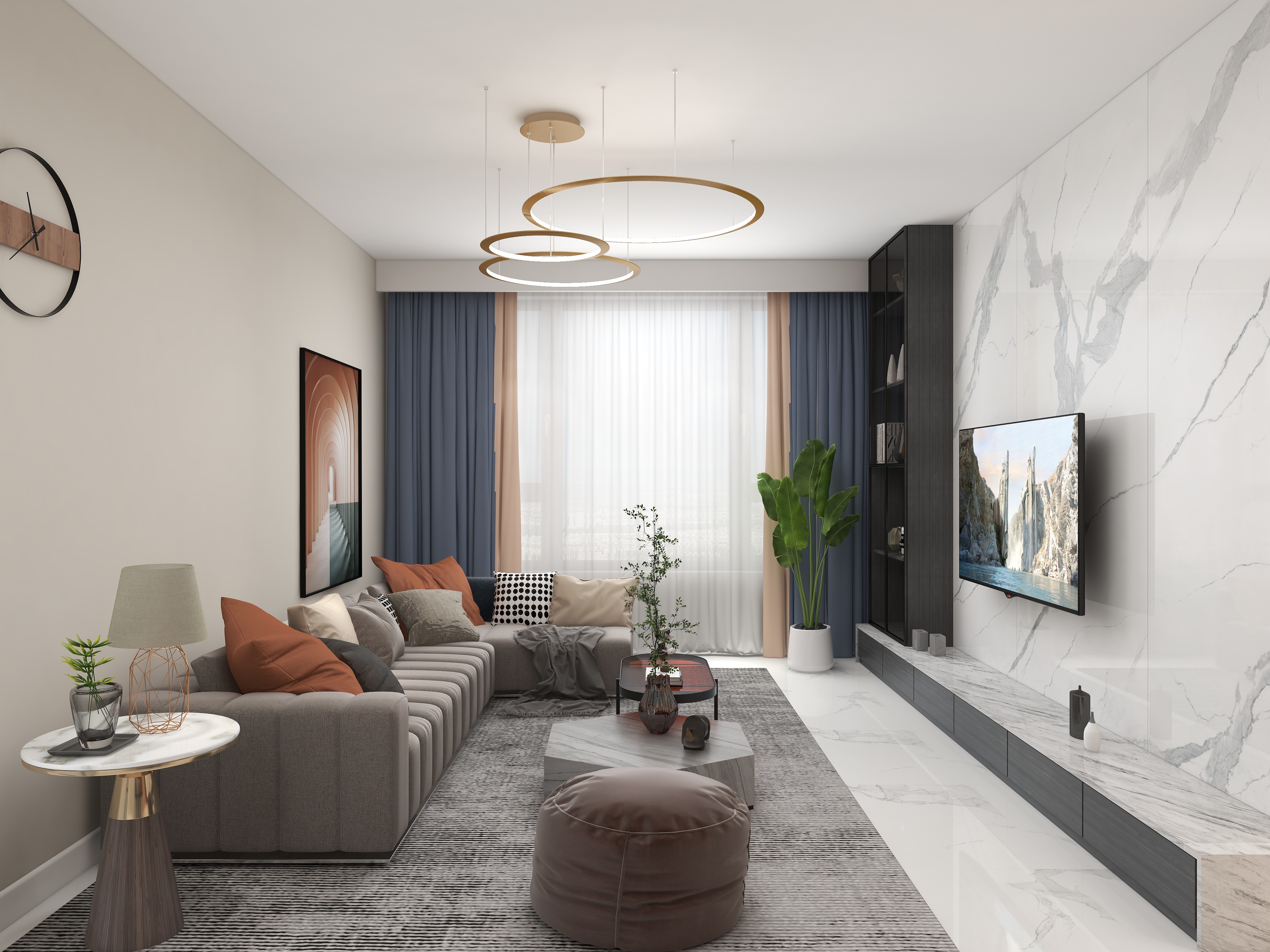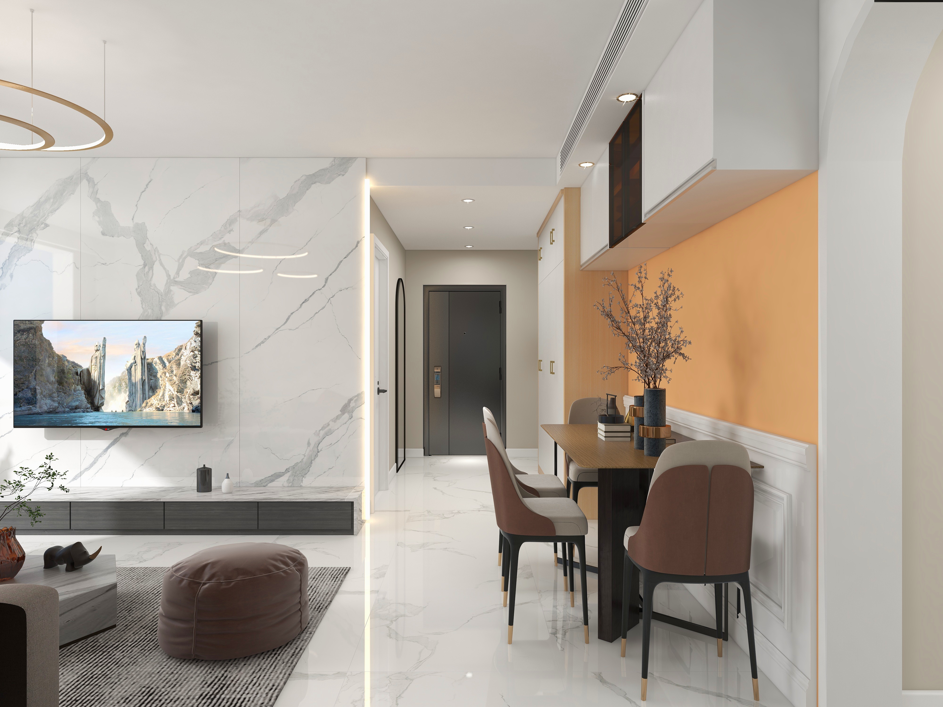 此戶型是比較適合業主的居住需求,唯一缺點就是餐廳位置與主通道位置沖突,設計多功能餐桌滿足多人就餐。客戶喜歡輕奢簡約的感覺,所以使用了巖板瓷磚和金屬材質,結合一些線性燈,營造住宅視覺與感覺的舒適感。