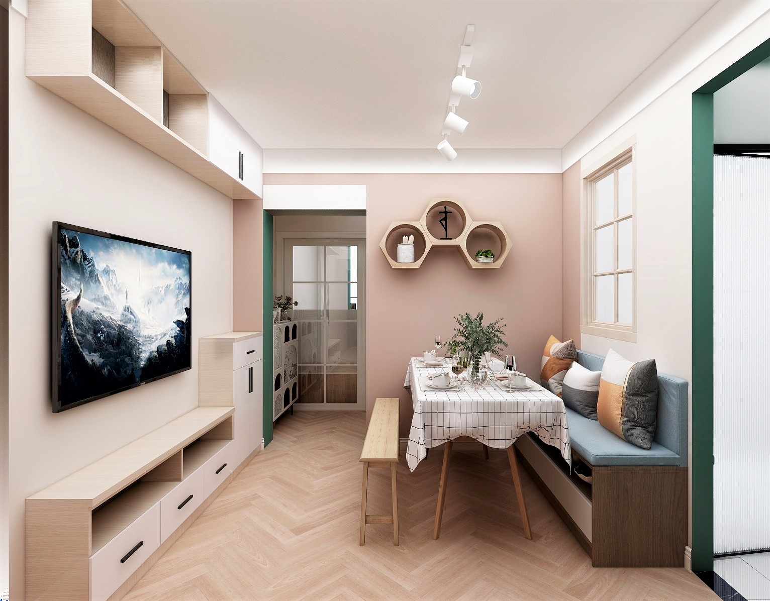 客餐廳使用沙發(fā)卡座和多功能餐桌實(shí)現(xiàn)客餐廳一體的功能