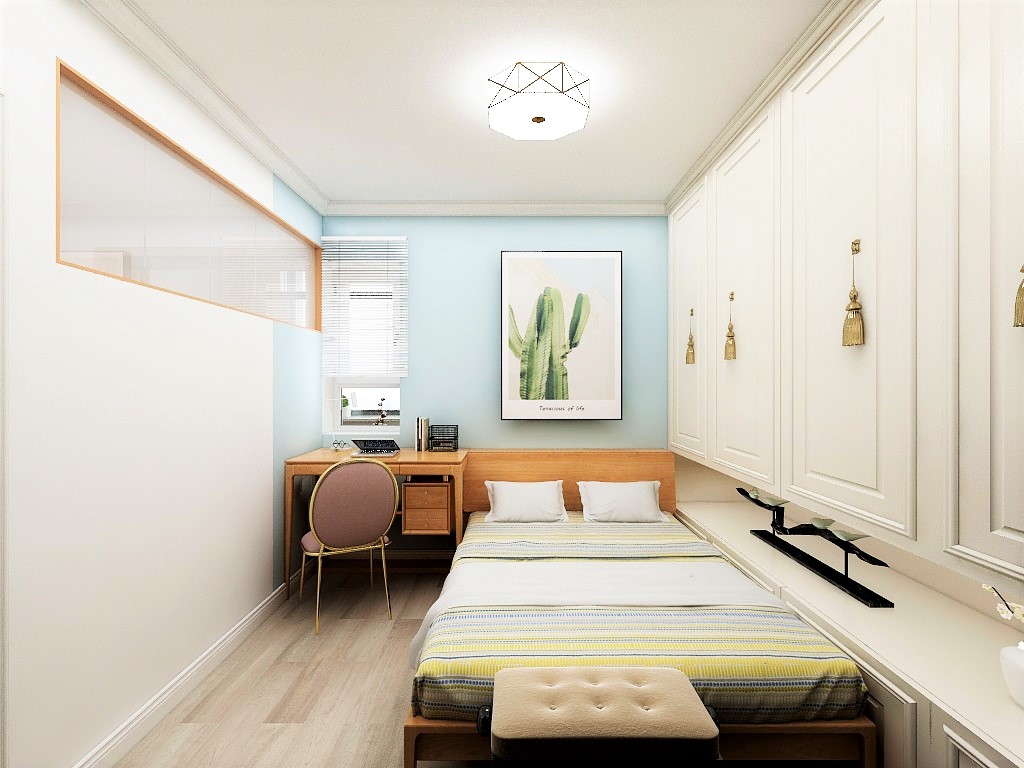 這是一個小一居室,客戶為將來孩子上學(xué)準(zhǔn)備的,需要給孩子一個獨(dú)立切有陽光的臥室。還需要單獨(dú)的客餐廳區(qū)域。根據(jù)客戶需求合理的給他規(guī)劃了室內(nèi)空間