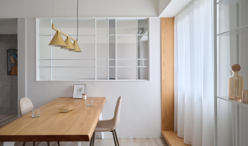 在餐廳這面墻,增加長虹玻璃營造精致感黃銅質感的吊燈,就餐區(qū)搭配原木色的餐桌,復古又溫馨,