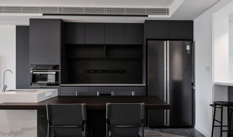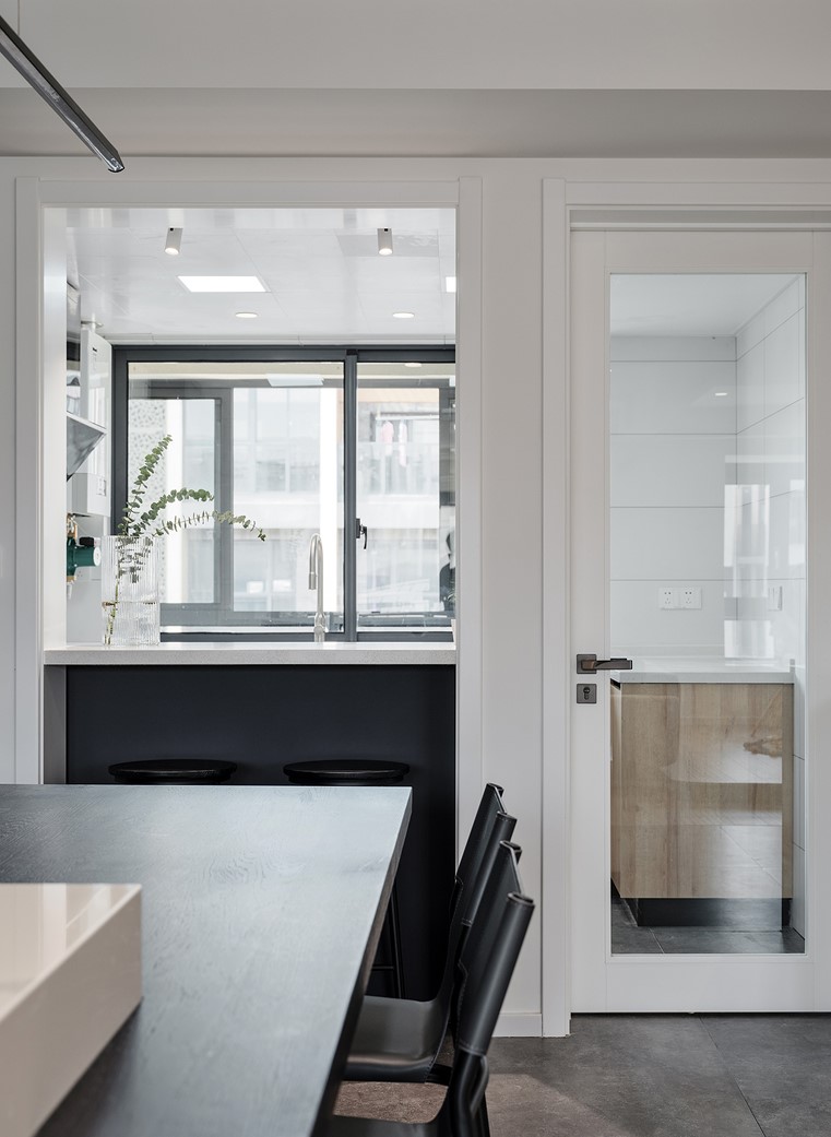 餐廳是極簡的現代風格,餐桌和島臺一體,干凈整潔,黑色與白色貫穿整個空間。