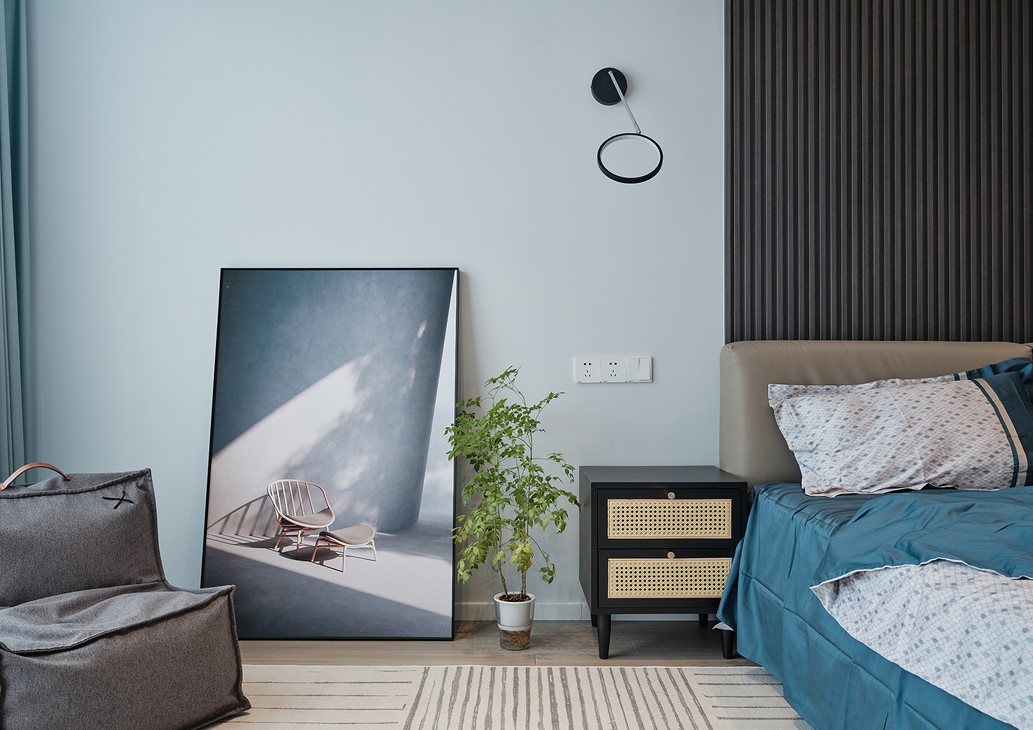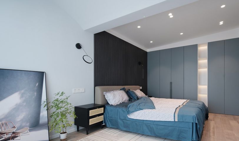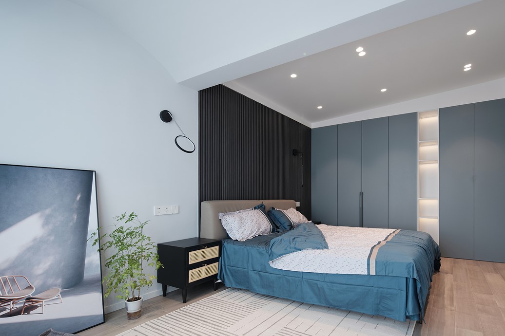 原本的陽臺歸進了主臥,利用圓弧吊頂弱化了梁的存在感,木格柵作為床頭背景,搭配藍色四件套,營造出靜謐沉穩的氛圍