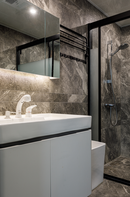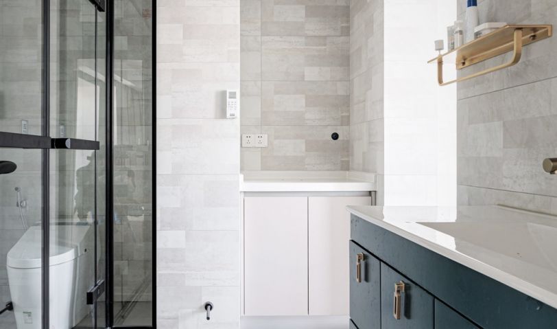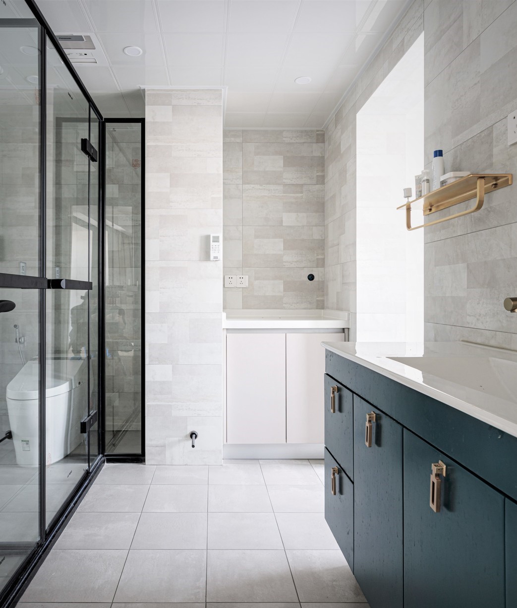 分離式設計需要的是空間。能滿足的盡量是滿足,使用起來確實方便,對于一層客衛,整體搭配上以深色磚來凸顯氛圍品質感,瓷磚的大小構成比例的變化,讓單一色調的瓷磚更加有層次感。