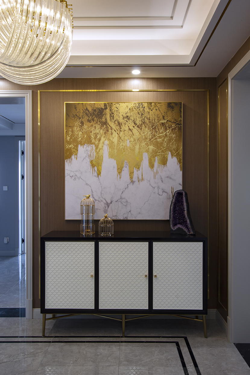 玄關處因為是各個空間流線的中轉站,所以玄關柜設置在了一側。頂面吊頂造型和地面黑色走邊呼應,中間配了一個適中的水晶燈。