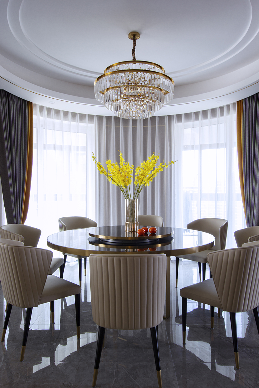 餐廳因為考慮到要放圓桌,所以對應設計了圓頂造型。頂面內嵌式的不銹鋼線條,讓簡單的吊頂更顯質感。
