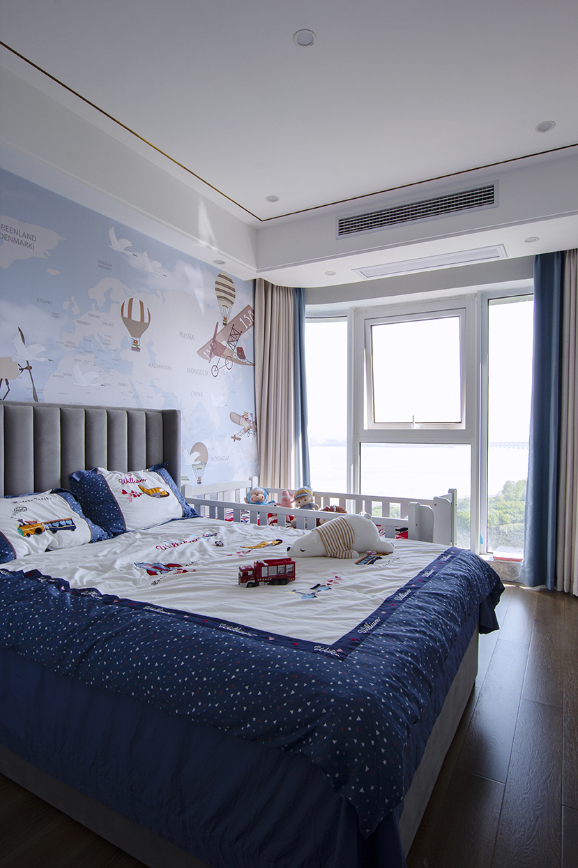 因為是個BOY,所以小孩房的整體色系偏向藍色,背景墻專門定制了一張卡通畫。