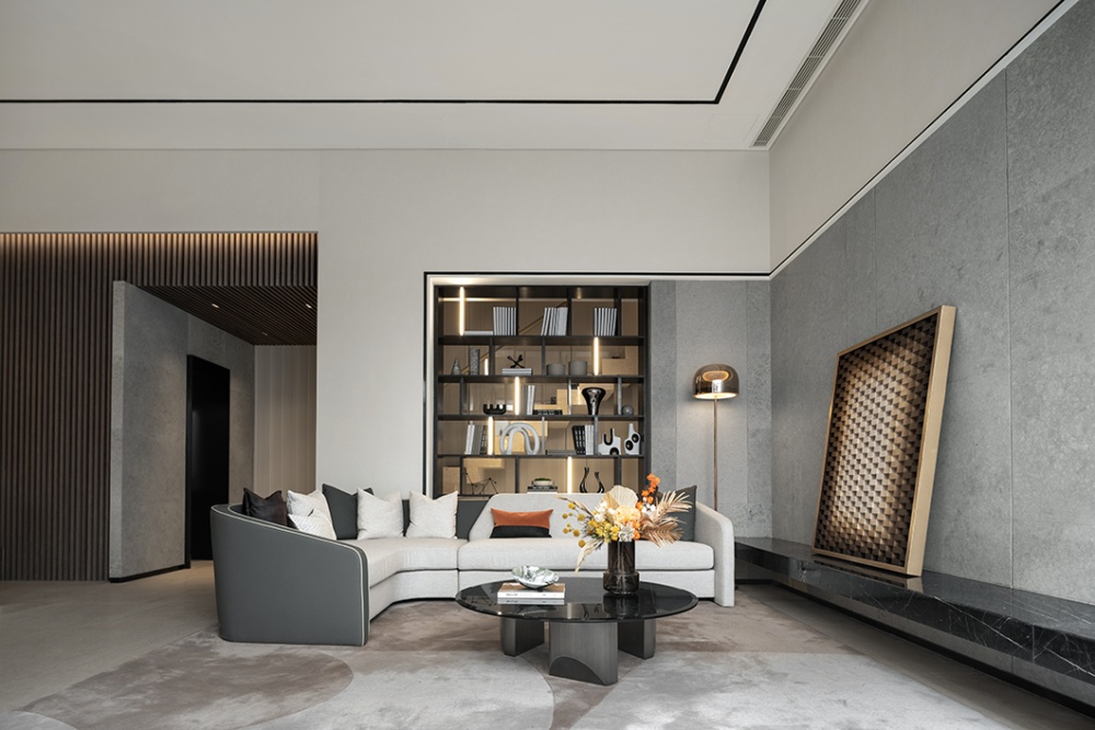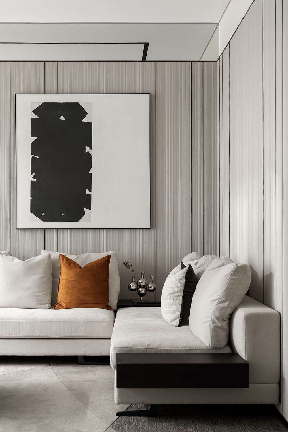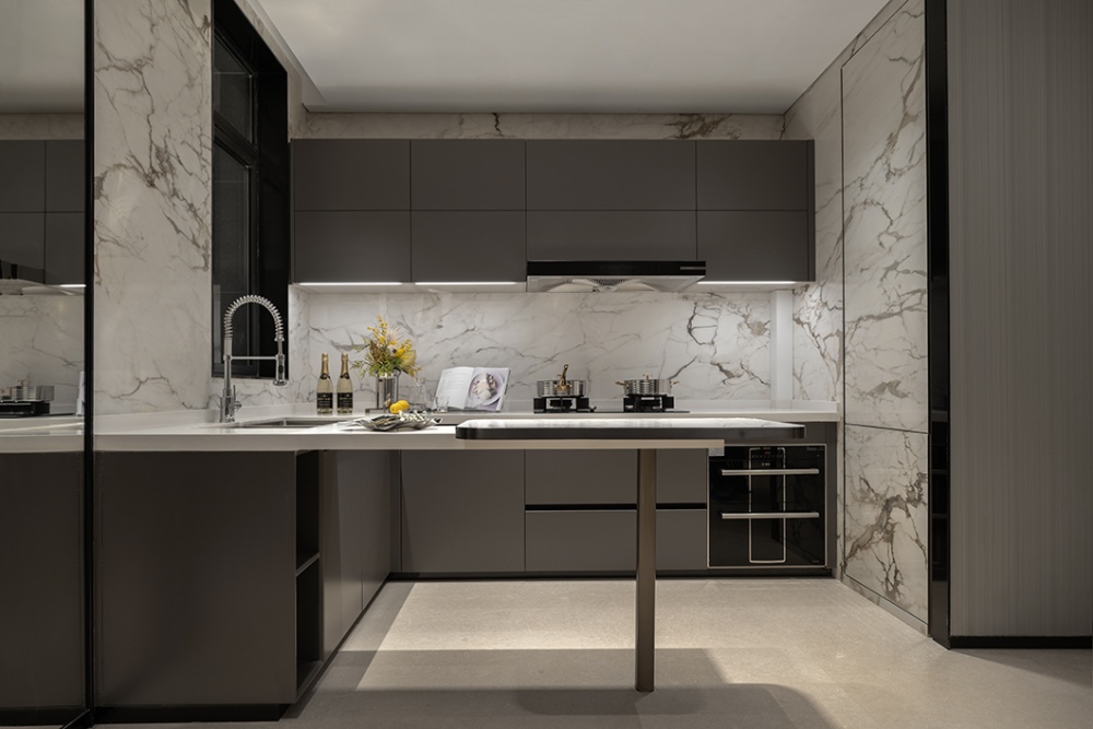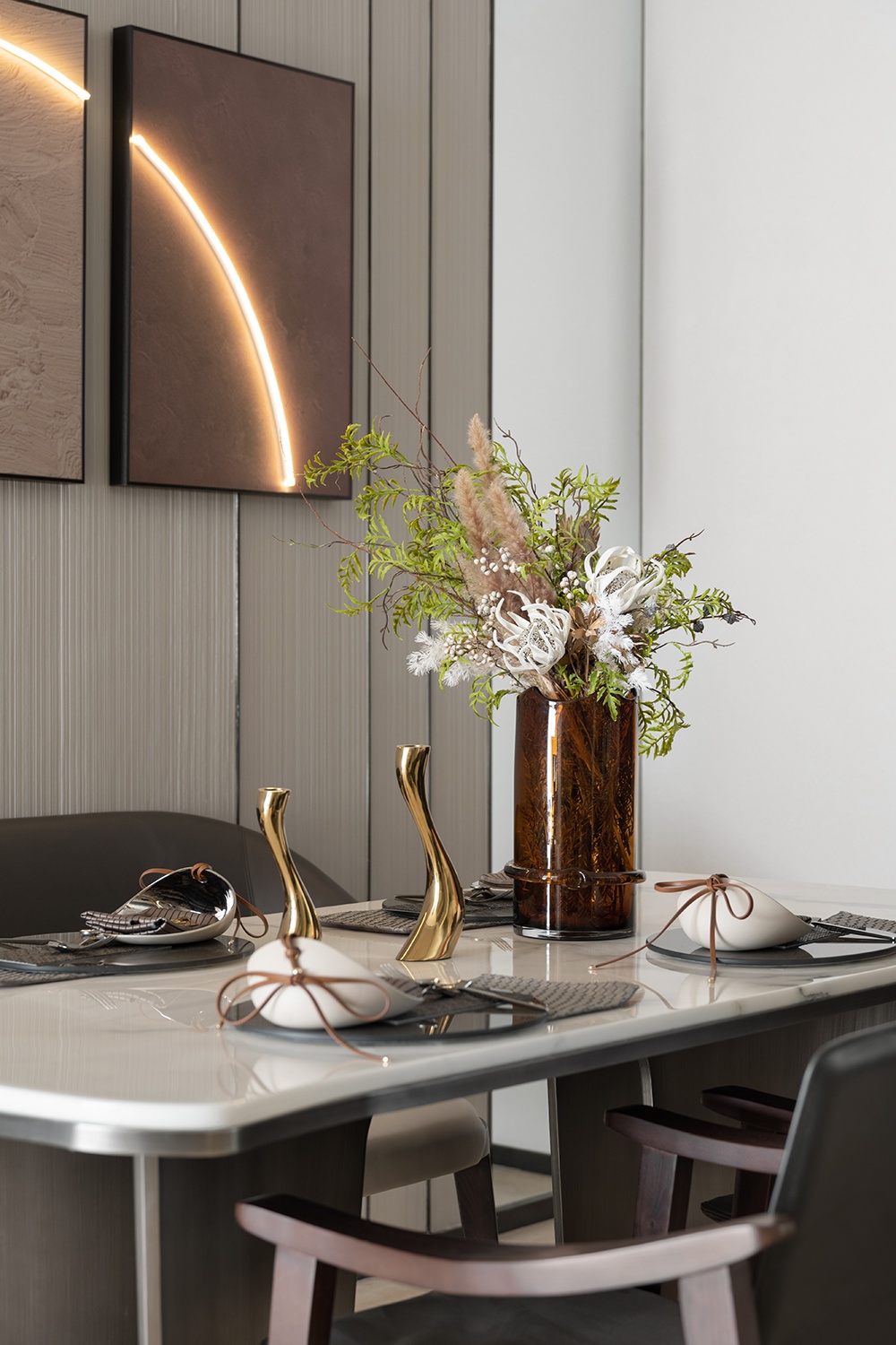 開放式餐廚空間,簡練線條托起華美肌理,色調與材質呈現珠聯璧合的疊加魅力,兼以藝術裝飾調味精致細節。