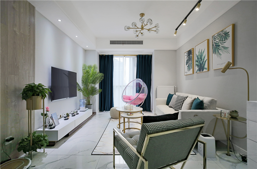 整體客廳空間以白色為主導色,配合胡桃木色墻板和地板,局部墻面點綴黑色,中和整個空間,為了使得空間相對活潑,軟裝的選擇上跳躍了一些,讓整體材質與顏色相互呼應。