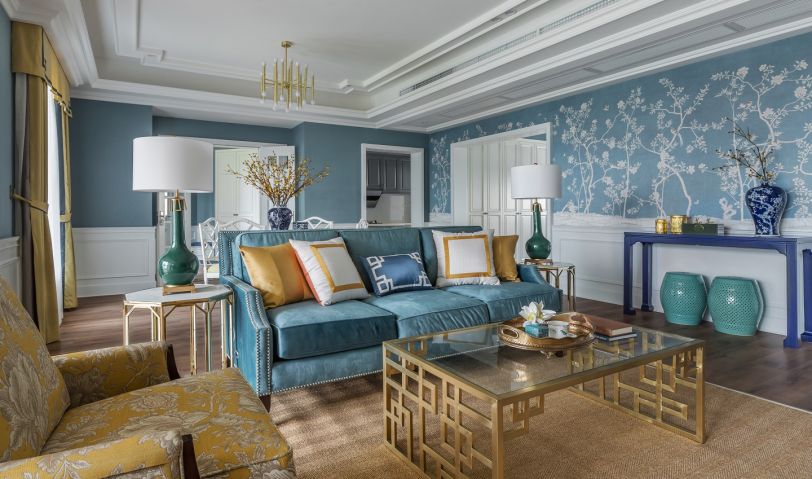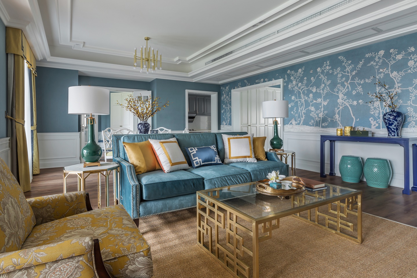 客廳以優(yōu)雅的灰藍(lán)色為基調(diào),搭配明黃及祖母綠的軟裝飾品,使空間更具活力,金色元素的運(yùn)用,提升空間品質(zhì)。幽深的藍(lán)與唯美的黃在濃墨重彩的對(duì)比下,彰顯空間的優(yōu)雅魅力。沙發(fā),茶幾,地毯及餐桌等不同材質(zhì)的運(yùn)用,打造出豐富的層次感。