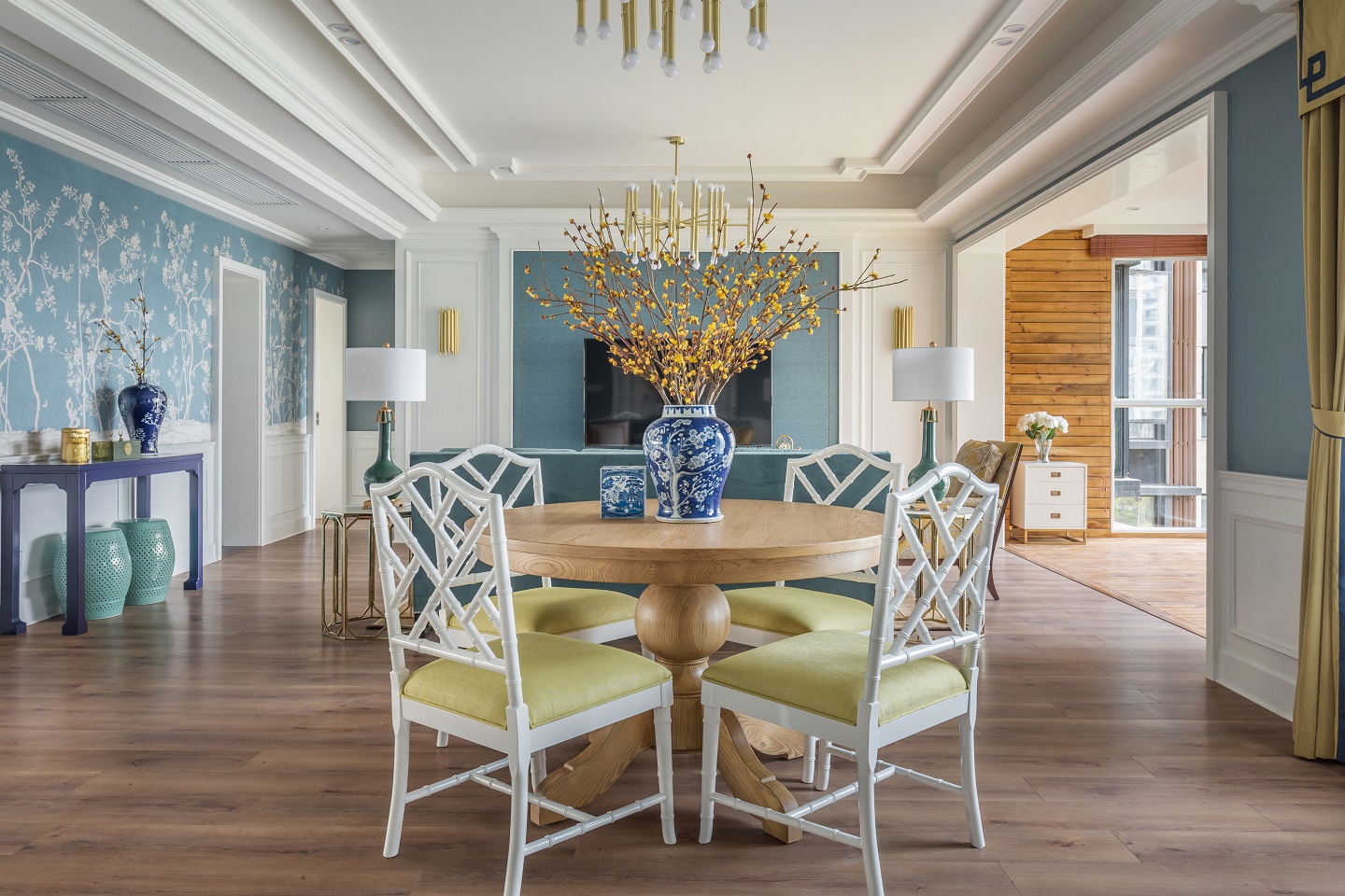 餐廳搭配中式Chippendale椅,椅背的竹節(jié)造型,極具藝術(shù)觀賞性,為空間增添了獨(dú)特的東方韻味。與明黃色窗幔的搭配,打造出輕松優(yōu)雅的用餐空間。