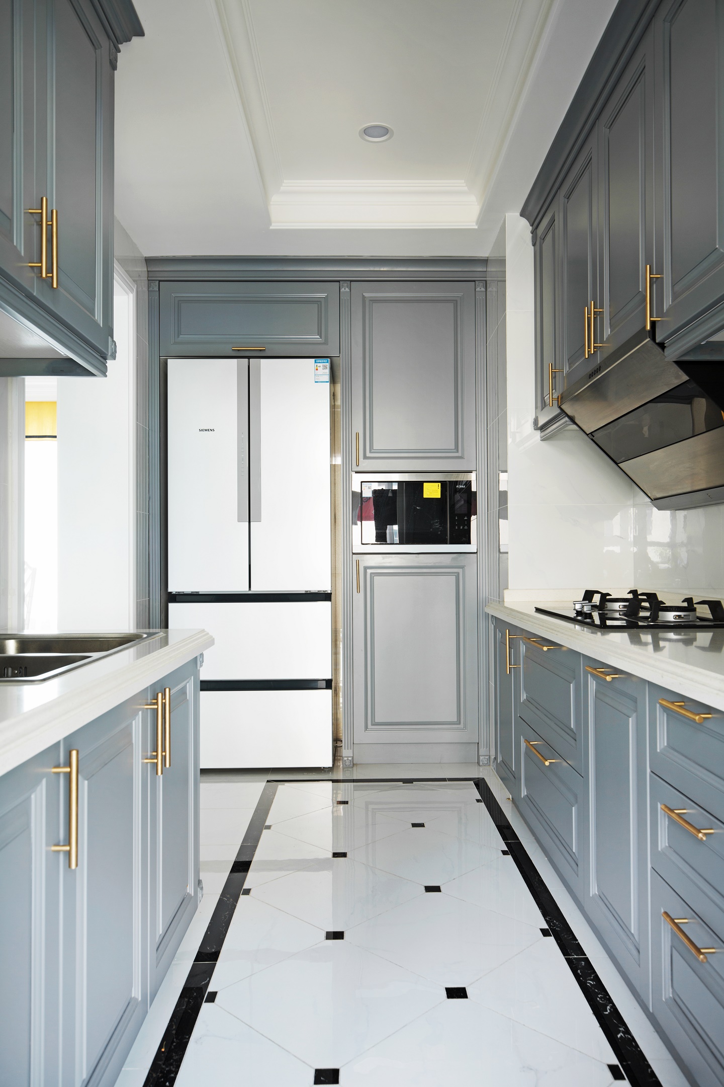 廚房空間中,櫥柜部分延續(xù)灰藍(lán)色調(diào),配以白色拋光磚及白色臺(tái)面,點(diǎn)綴金色五金件,使整個(gè)空間潔凈明亮又不失高雅。
