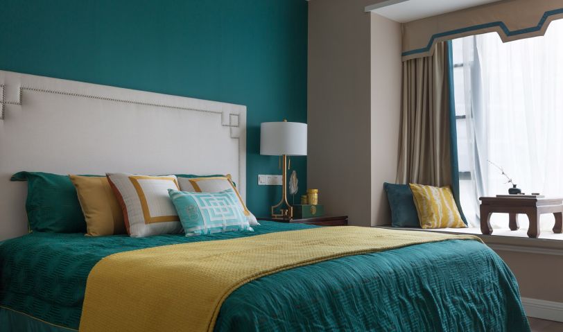 主臥大面積采用淺咖色調(diào),床頭背景則使用孔雀綠做對(duì)比,為空間平添一抹優(yōu)雅與高貴,也帶來了深邃感與寧?kù)o氛圍。