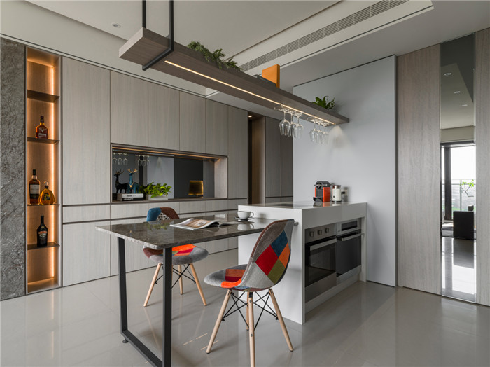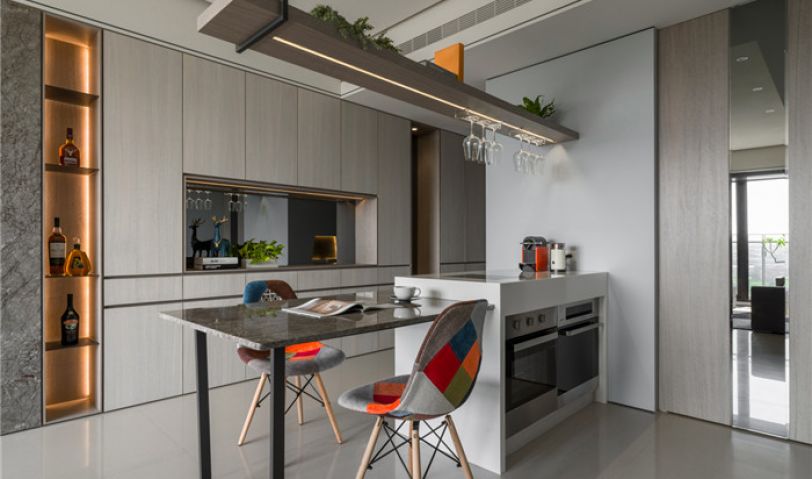 墻壁面天地溝縫的表現(xiàn),展演著精湛的工藝,品味設(shè)計(jì)的重點(diǎn)在細(xì)節(jié)而不在堆砌,透過一道木作隱藏式推拉門區(qū)隔輕食區(qū)與廚房。因應(yīng)現(xiàn)代人飲食習(xí)慣,打造隨時(shí)可與客廳互動的開放式中島,并將中島、客制化餐桌串聯(lián),獲得更寬闊的使用臺面,臺面底部安排電器、烤箱等設(shè)備收納。在與電視墻之間的接縫畸零處、善用其深度打造品酒置放架,讓餐區(qū)既是歡聚小酌的地方,也是主婦愛用的輕食料理天地。客制化餐桌使用意大利灰網(wǎng)石與白色島臺搭配,呼應(yīng)了電視墻為空間主題定調(diào)。餐廳區(qū),于餐桌上方將酒杯吊架結(jié)合燈光照明,充分體現(xiàn)設(shè)計(jì)巧思,以最精簡的形式落實(shí)實(shí)用功能,并美化場域風(fēng)貌。