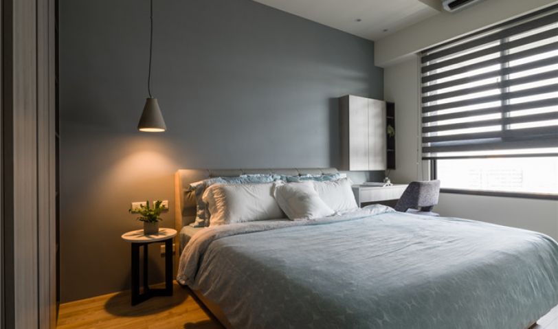 秉持無把手的柜面設(shè)計(jì),讓量體以最無壓的方式存在著,主臥,承襲著簡約利落原則,同樣援引百搭的灰藍(lán)色調(diào),打造無壓放松感。