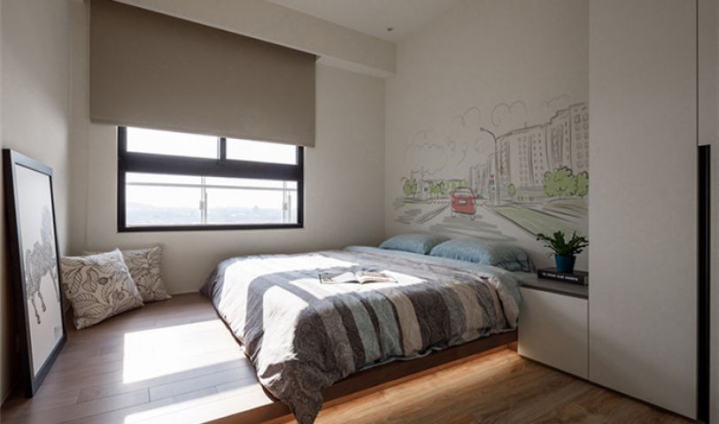 在次臥房內(nèi),選擇將地坪架高,并配置可移動式的家具,于床頭墻貼上城市風(fēng)景客制化墻紙,讓房間在潔凈透白中也充滿著特色,但也具備未來可變換機(jī)能的彈性。貼地床具形式保留開放感,再搭配采光的明亮進(jìn)駐,使房內(nèi)絲毫不覺封閉,并巧妙于床頭加入彩繪客制化墻紙,讓視野更加活絡(luò)。