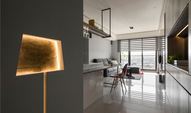 空間主軸就從進(jìn)門的一盞燈開始,木作嵌壁立燈造型,以閃銀灰色礦石巖片為底,讓墻多了創(chuàng)意變化。