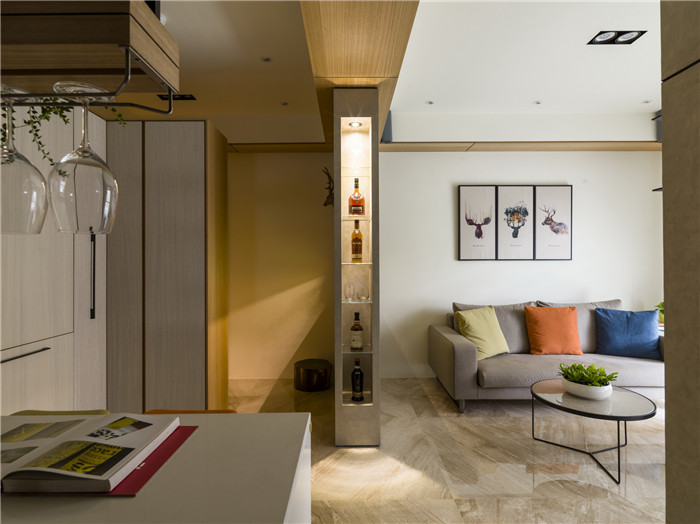 以玄關隔斷為基點,入戶后隱形指引至客廳區、餐廚區、臥房區動線。精致材質與工藝、低調卻講究的背景,讓整個空間暖感視野得以優雅呈現。考慮到坪數局限,讓墻面、柜體盡可能不占去太多空間,于是舍棄厚重的石材、木皮等建材,采以獨特的 Spiver 意大利頂級特殊涂料、鋪敘玄關與電視墻,不但網羅大器感,也同時輕簡化立面與量體;地板則采以蒂諾大理石鋪展,營造公領域的精致感,在高雅的背景之中,適度妝點粉橘、蒼綠、寶藍等馬卡龍色彩抱枕,營造出暖調而高雅的北歐氣息。電視墻Spiver 意大利頂級特殊涂料延伸至次臥隔墻,讓主題量體呈現。大地色系搭配粉橘、蒼綠、寶藍,在沉穩中多了粉色繽紛。地板鋪設明亮帝諾大理石,鏡射效