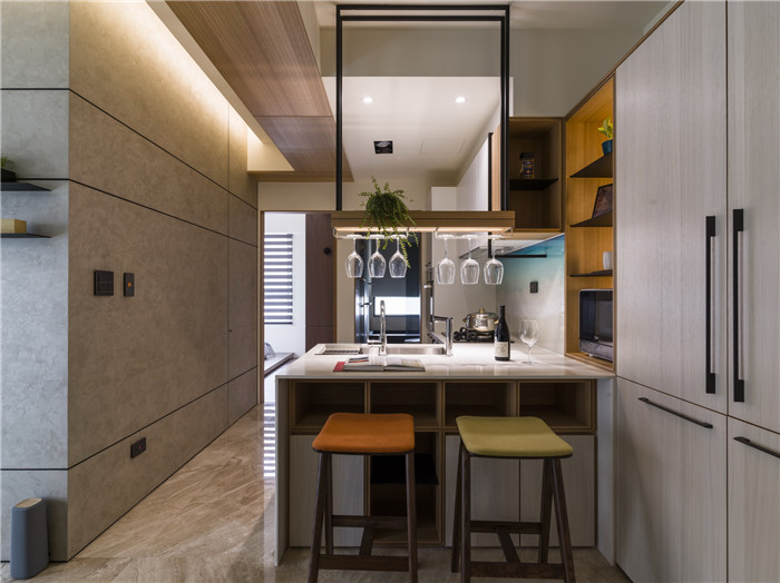 在天花梁柱與柜體皆使用 KD 實木板加以統合;尤其,空間中更融入 1 公分的細膩溝縫處理,像是在電視墻面上,即運用線條的延伸,轉折導引進入臥房的動線,以線條作出門片隱形化的細致處理。餐廚區每一項柜體尺寸到收納形式,都經過縝密規劃,在料理臺墻面加入彩印玻璃,印出藍色海灘的意象,讓沒有窗戶的廚房、也能納入浪漫的海景畫面。餐廚領域依照一家人需求量身訂制,考慮到人口簡單,于是以吧臺取代餐桌。