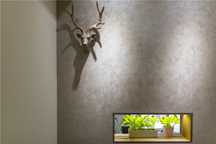 墻面佐以絲絨感意大利藝術涂料,再加入趣味的鹿頭裝飾,營造出暖調而高雅的北歐氣息。
