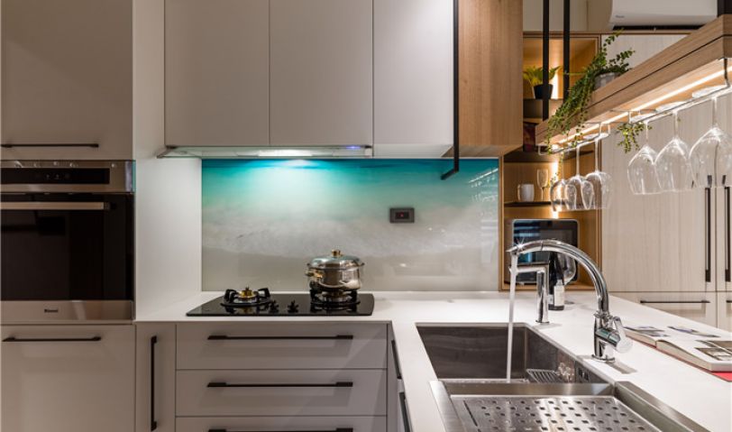 餐廚區每一項柜體尺寸到收納形式,都經過縝密規劃,在料理臺墻面加入彩印玻璃,印出藍色海灘的意象,讓沒有窗戶的廚房、也能納入浪漫的海景畫面。餐廚領域依照一家人需求量身訂制,考慮到人口簡單,于是以吧臺取代餐桌。