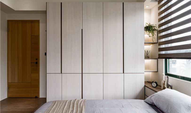 讓兩間臥房都顯得較小,於是在主臥內,選擇架高地坪、以貼地的床具形式保留開放感。窗面採光的明亮進駐,使房內絲毫不覺封閉、反倒顯得具有呼吸感,簡約中更注重細節,得以彰顯品味。刻意不施作到頂的量體,收納功能更人性化也避免過重壓迫感,玫瑰金床頭吊燈,為主臥室增色許多。衣柜門片延續全空間精細的現場作工貼皮,也舍棄五金拉手由木工藝暗拉手取代,兼顧了功能與線條構圖,全現場打造木工藝一體成形的複合式床架,把單層空間作出雙層有效利用,藉著機能的向上延伸,以及無所不在的收納機能,徹底激發小空間的坪效。