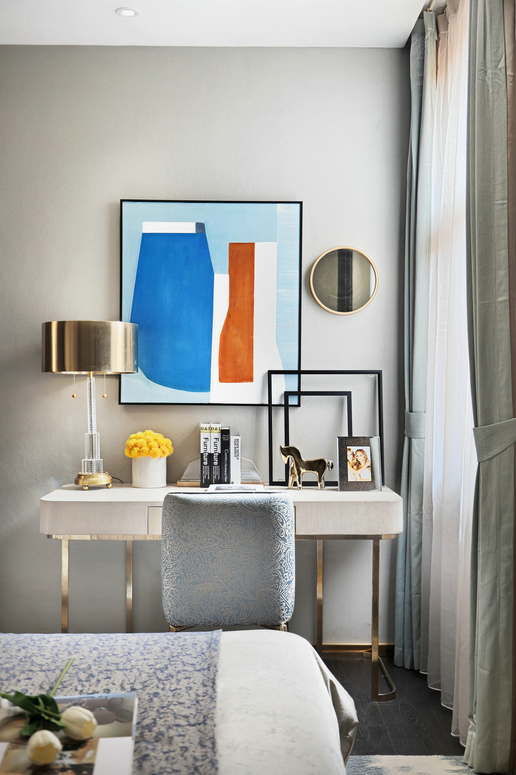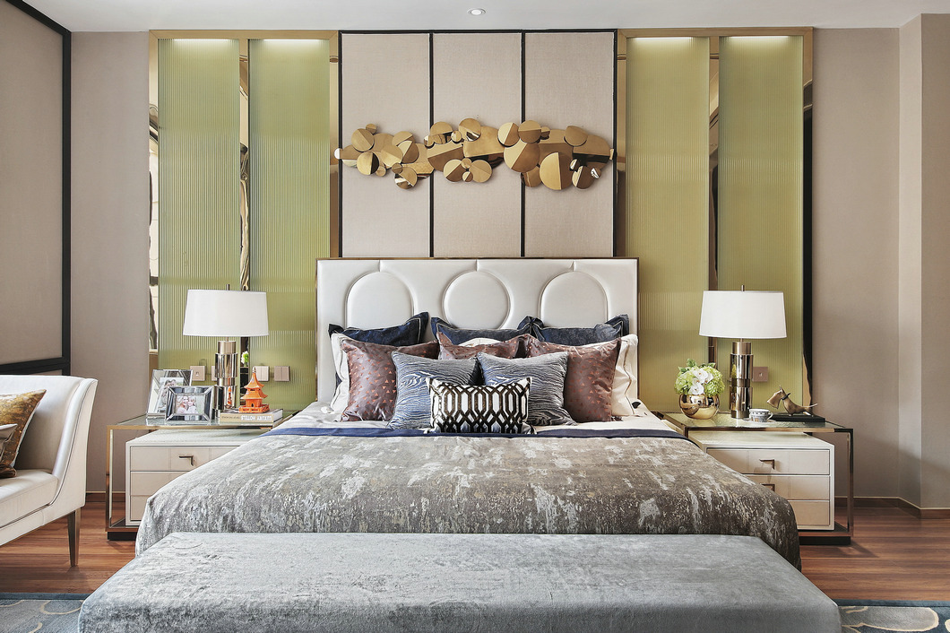 臥室以森系色調為主,自然清新,營造出更加放松而舒適的休息環境。淺色系的床頭背景墻與深色的床品形成色彩的對比,一明一暗,一深一淺,鮮明的差異化表達讓視覺層次更加豐富。造型簡約的金屬臺燈,典雅細的線條透露出精巧的美感,金屬的光澤為臥室空間增添了幾分靈動,搭配極具金屬線條感的床頭桌,讓每一次的使用都恰好符合手臂伸展的舒適角度,從細節出發打造美好生活。