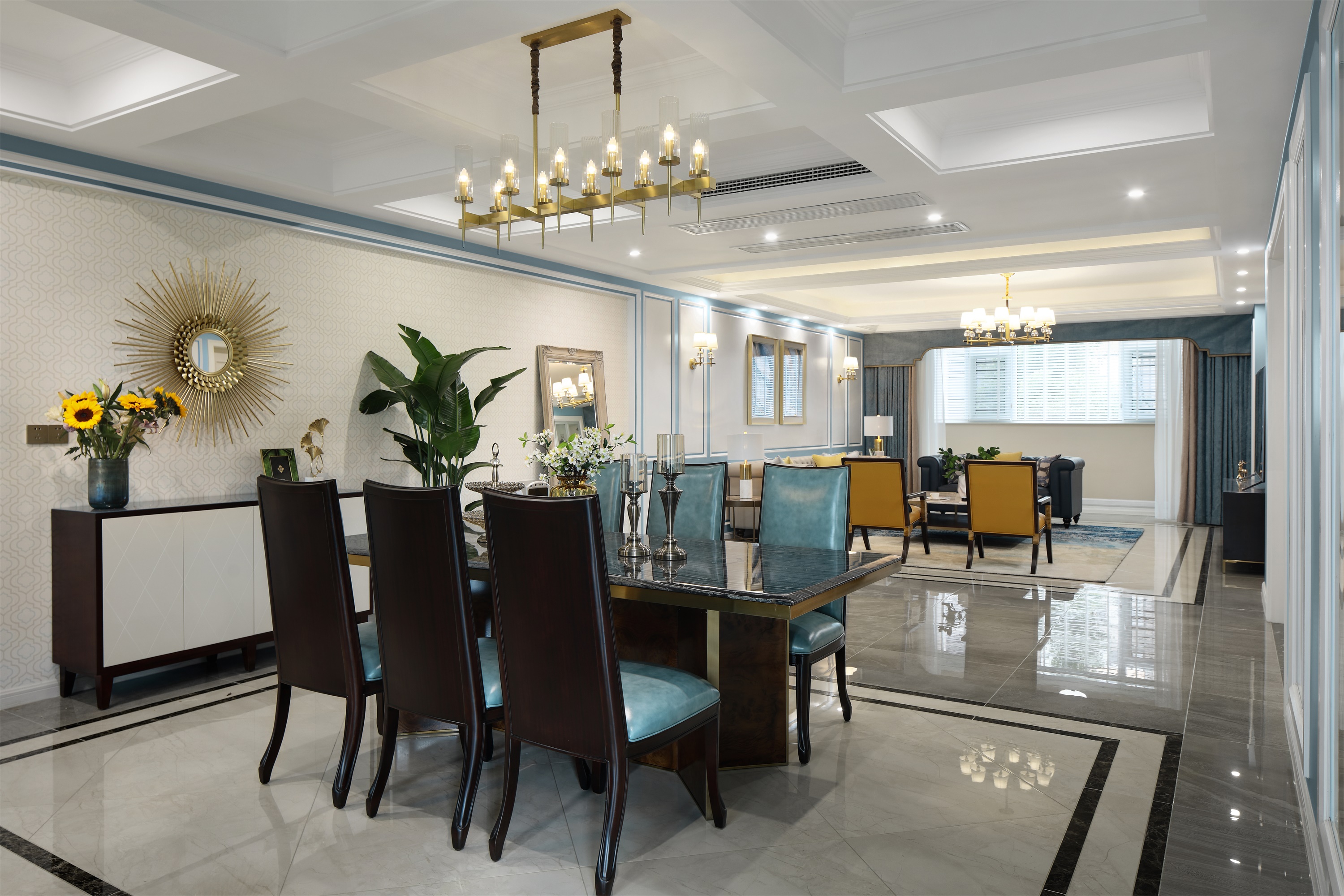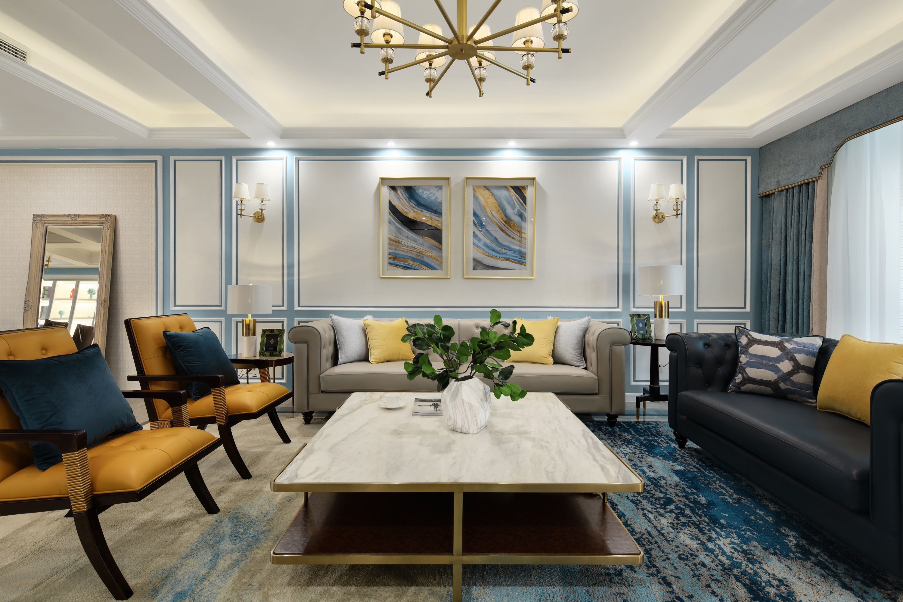 客廳以米白色的背景與藍色的護墻線條打底,留白的設計手法表現空間的視覺效果。壁燈與洗墻燈的完美配合,保證整體照明節奏。在家具的選擇上,用磨砂面的皮質沙發與大理石茶幾將輕奢質感歸于生活。