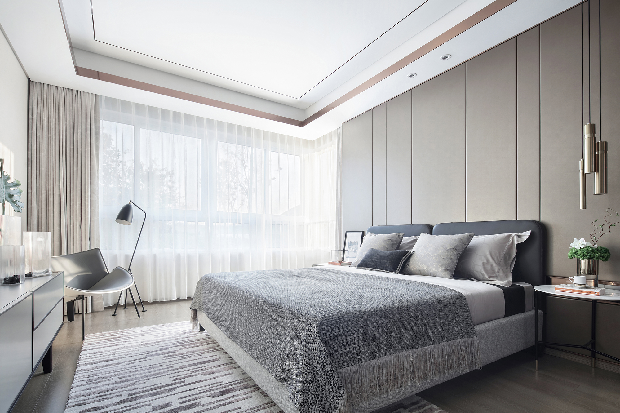 主臥頂面、立面均可見客餐廳的手法,呈現沉靜理智。吊燈與落地燈呼應,表現出細膩的質感層次,于時尚別致中暗藏迷人細節。陽光緩緩滲入,溫暖流淌。