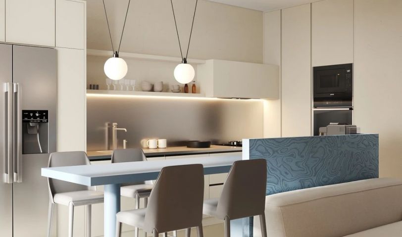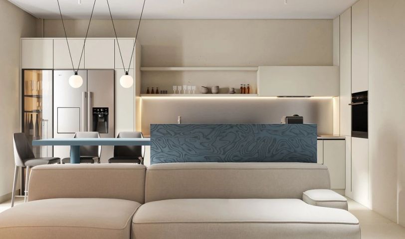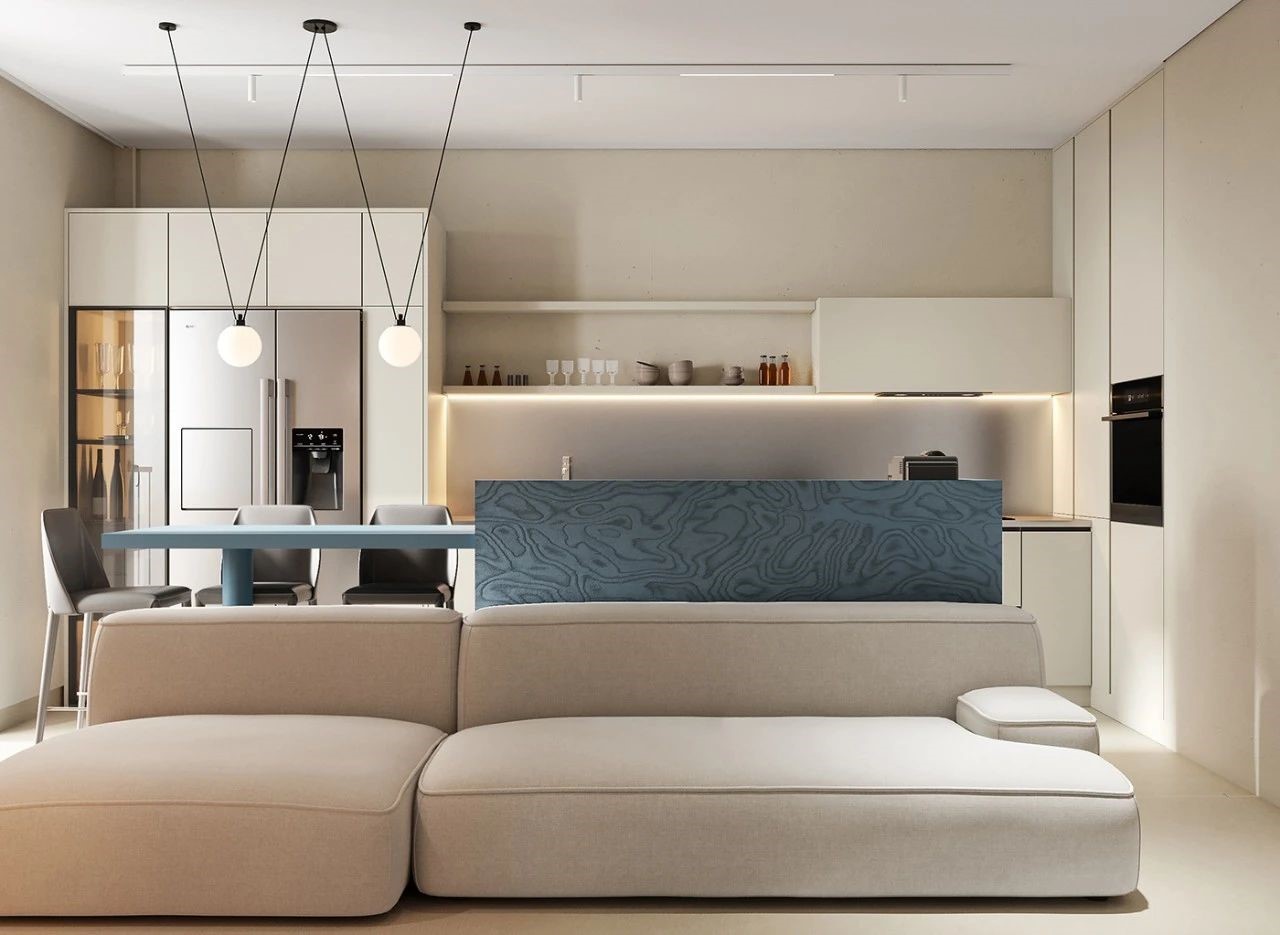 餐廳是廚房島臺(tái)的一個(gè)延伸,藍(lán)色的島臺(tái)以及灰色餐桌成為整個(gè)公共區(qū)域色彩的點(diǎn)綴,W 型的吊燈在餐桌的上方滿足照明的同時(shí)成為上半部分空間的裝飾。