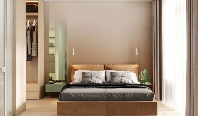 選擇了咖色和薄荷綠來打造主臥空間,短絨的床架和蓬松的床頭是稍深的咖色。