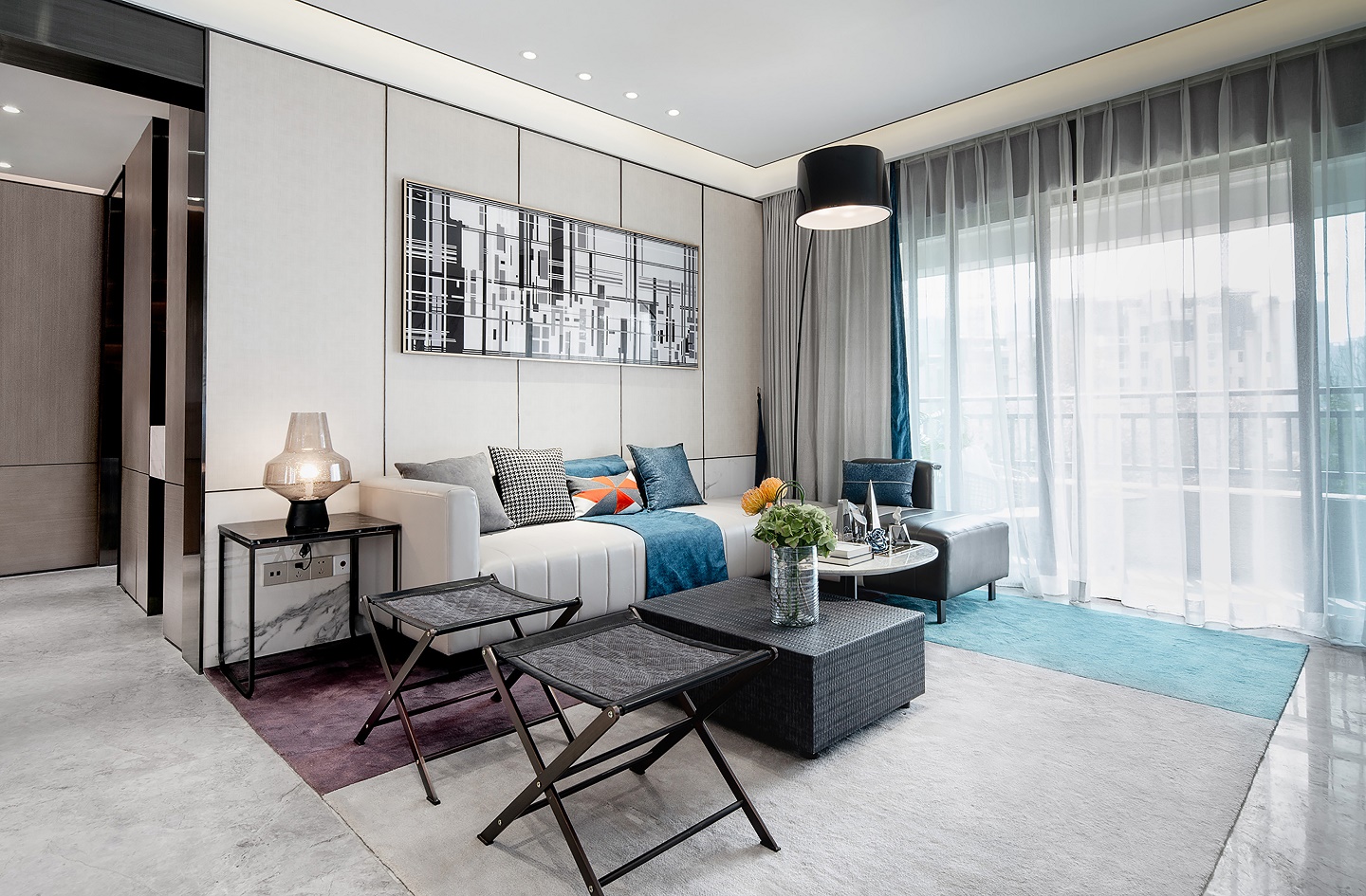 黑與白,擺設與塊面,獨立又相融,統一于客廳的空間結構,散發出空闊淡泊的風度。沙發線條利落,結合高低組合形式的茶幾,于簡約中蘊藏豐富的層序美。地毯色調、沙發抱枕以及餐廳座椅彼此呼應,點亮空間,生動感躍然而出。飾品擺件恰到好處,插花為空間注入一份明快,寥寥數筆,空間氣質盡顯。