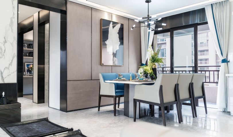 擁有絕佳采光的客餐廳中,一桌、一椅,均凝聚著空間的形與神,見證著戶外庭院的四季交替。深沉的藍色餐椅,喚醒餐廳的活力。綠植的點綴,營造舒適自然的氛圍。