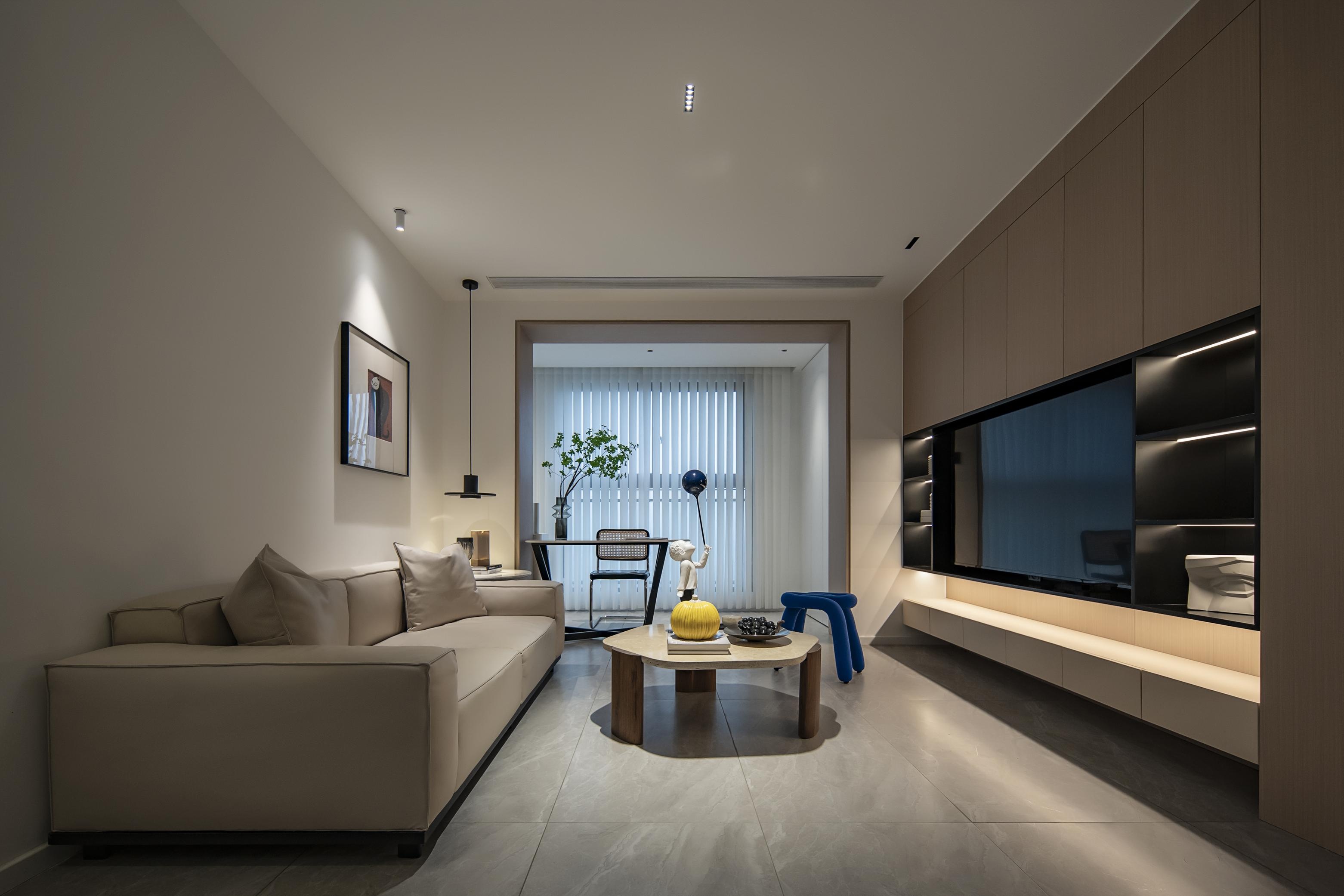 在客廳陳列中,為增強視覺觀感和功能分野,吊頂臺燈與書桌之間的搭配成為亮點,綠植成為黃金配角,實現了點線面的多面融合。客廳一分為三,生活空間、辦公空間、娛樂空間各占一席之地,讓客廳的空間分布更顯清晰與精細。
