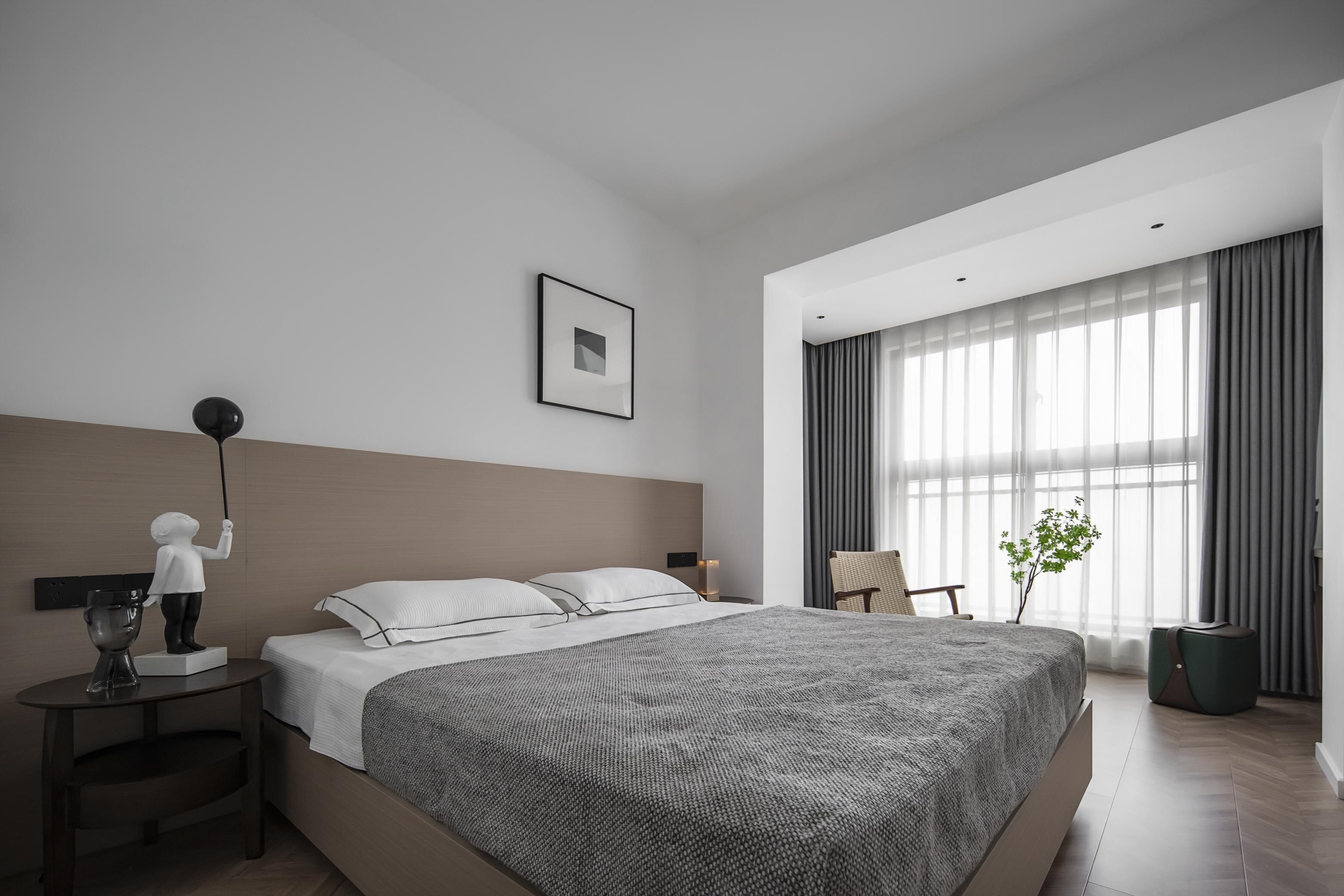 眾所周知,臥室尤為關鍵,在空間設計上,依然貫徹白底基調,更多用心在軟裝陳列之上,精心挑選床居用品、木質搖椅以及綠蘿植物,讓二人世界獲得更多空間。