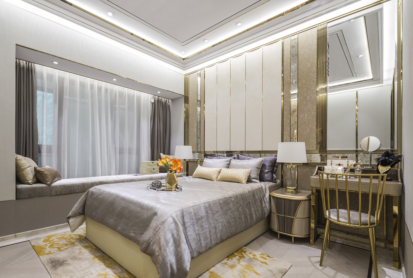 用金色,將之與米黃色結合構成空間的主調氣質,奠定清華流麗的美感基調,輕奢其形,態度其里。干凈利落的天花陰角線與陽角線平行起落,與墻體的鈦金縱向線條相應,立體感和層次感油然而生。
