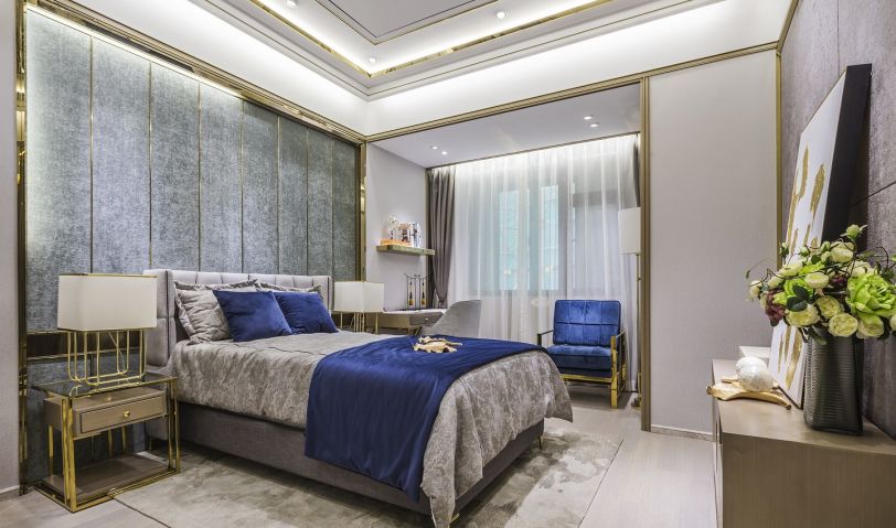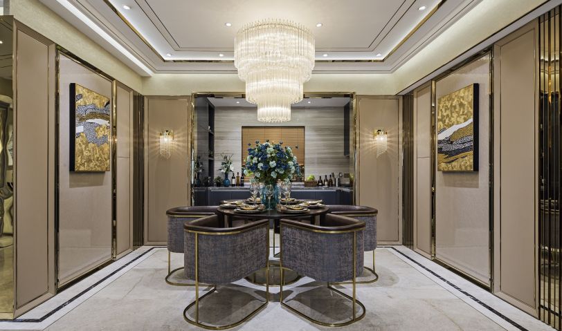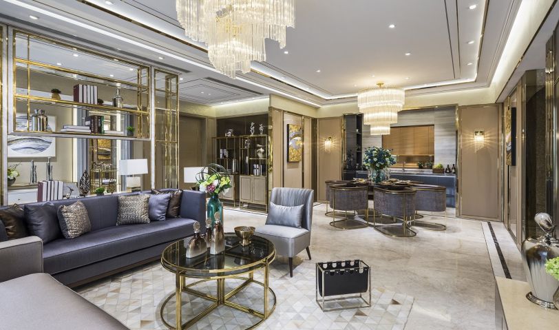 質感石材、高級皮質、鏡面玻璃與鈦金等不同材質靈活貫穿其中,將港式風格獨有的時尚與璀璨從本質上突顯出來,深淺結合的硬包沙發,圍合出生活的品質感。