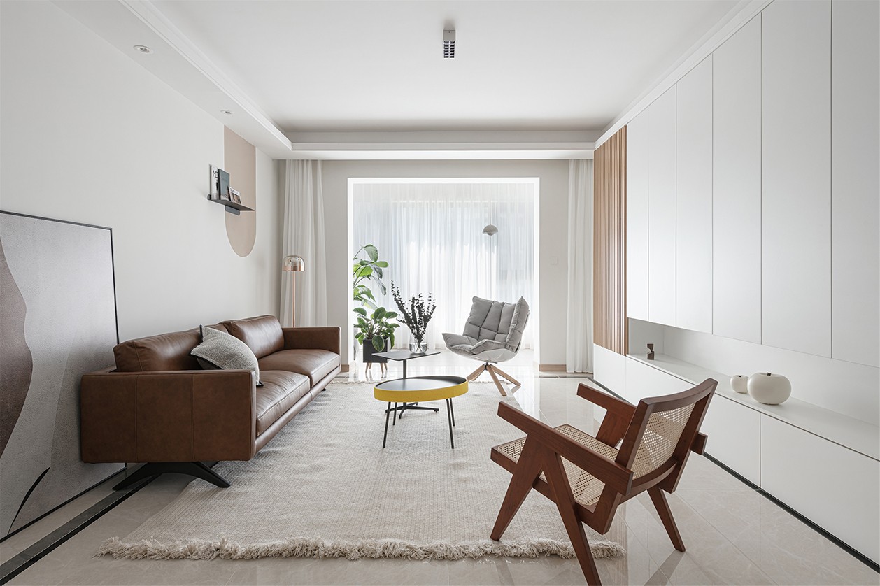 客廳頂面采用無主燈設(shè)計,拋棄了累贅的燈飾,讓室內(nèi)空間更顯輕盈通暢。