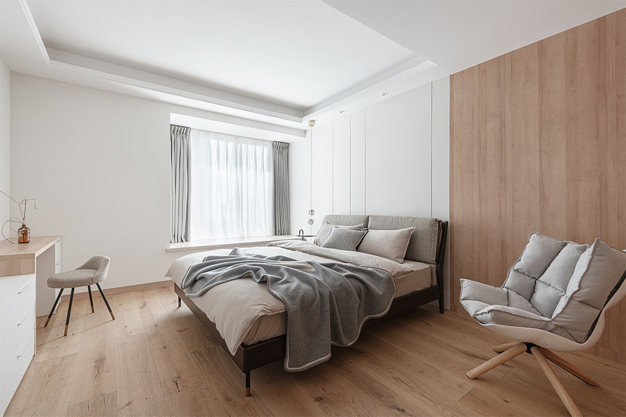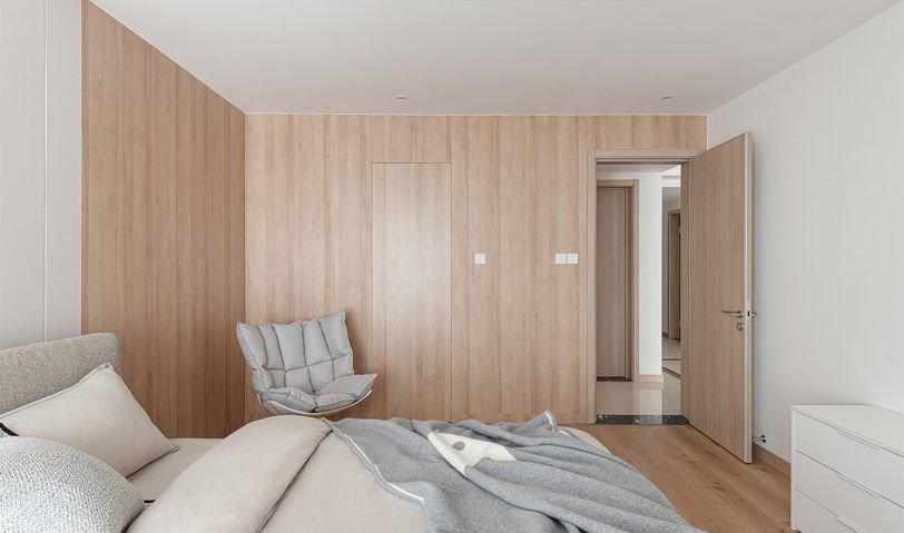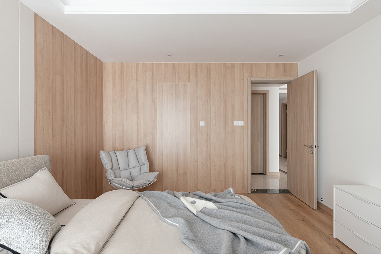 臥室地板和部分墻面采用天然樸實(shí)的木質(zhì)材料,營造出柔和靜謐的休憩氛圍,與公共空間的原木風(fēng)格相呼應(yīng)。