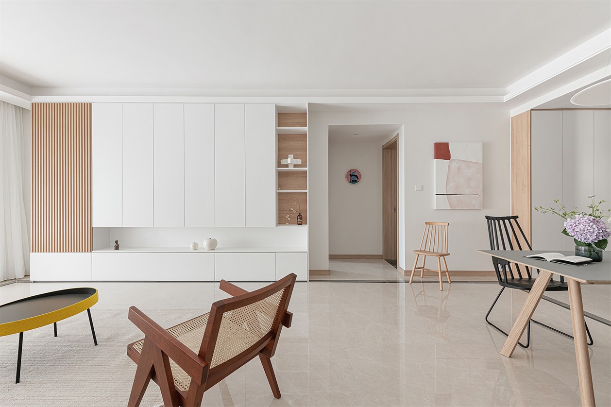 溫潤的原木色分散在空間里,氤氳出純樸素雅的居家氣質(zhì),而高飽和度的黃色圓桌、粉色熊貓裝飾畫為室內(nèi)帶來一絲活潑的氣息,中和了木質(zhì)的清雅。業(yè)主一家喜愛讀書,所以客廳打破常規(guī),用大面積儲物柜代替了電視,滿足了客戶的書籍收納需求。