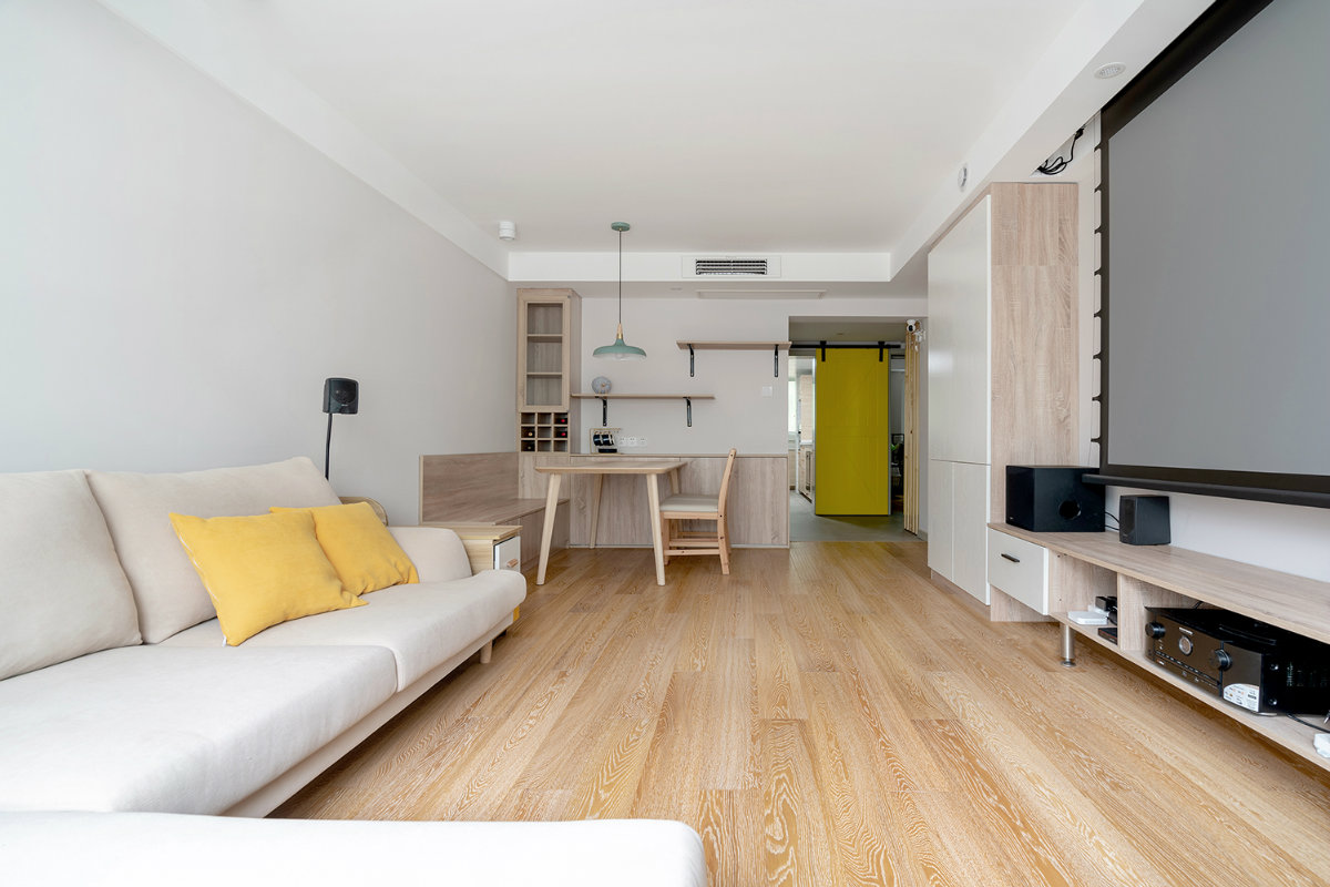 原木和亞麻的搭配是一個經典,氛圍感十足。同時轉角沙發的利用也讓客廳的活動空間變得更大,方便在客廳做一些運動和鍛煉。姜黃色的點綴,讓原本比較溫馨平淡的空間,多了幾分跳脫和活躍。
