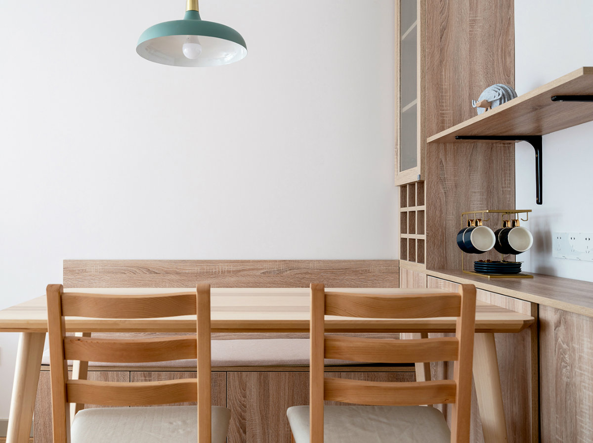 卡座一直是小戶型的不二之選,空間利用絕對高,還能增加儲物和收納。餐桌邊上設計了餐邊柜,平時的一些小電器方便使用,紅酒還有收藏的一些杯子也有空間展示。簡潔自然,給人的感覺就會是舒服干凈,沒有絲毫違和感。