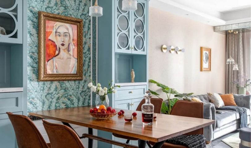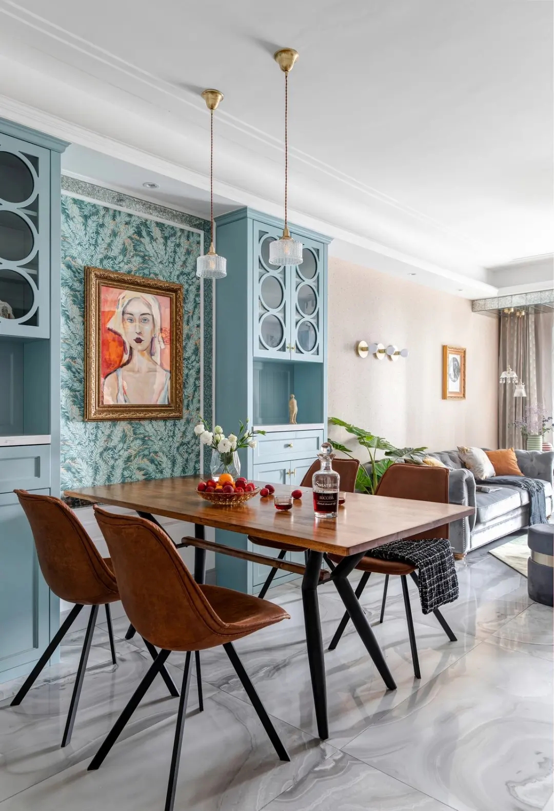 餐廳與客廳連貫,風格上也是采取混搭的設計,讓空間被各式各樣的藝術元素充斥。