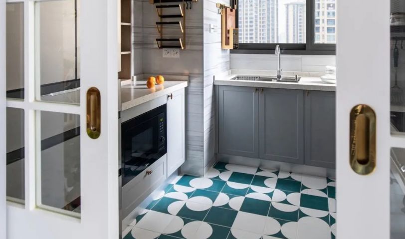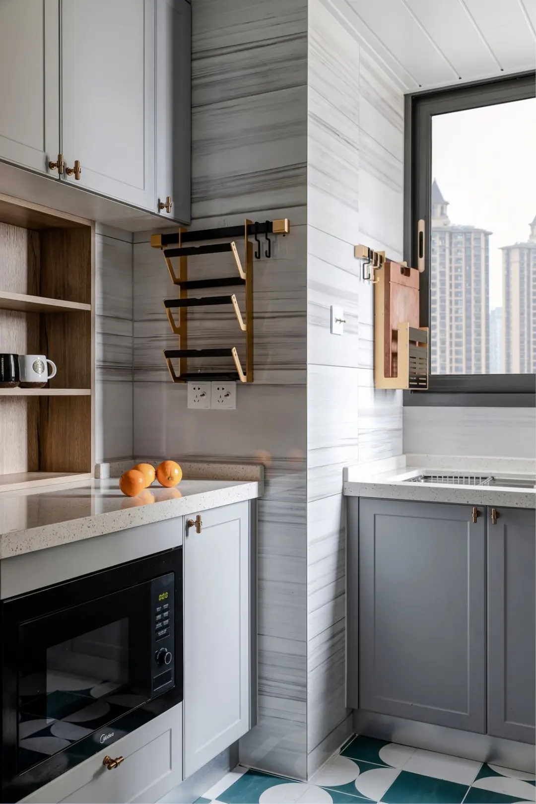 廚房地面是青白拼色的花磚,定制灰色櫥柜,在L字形的操作臺下,為主人帶來了一個明亮文藝的烹飪空間環境。